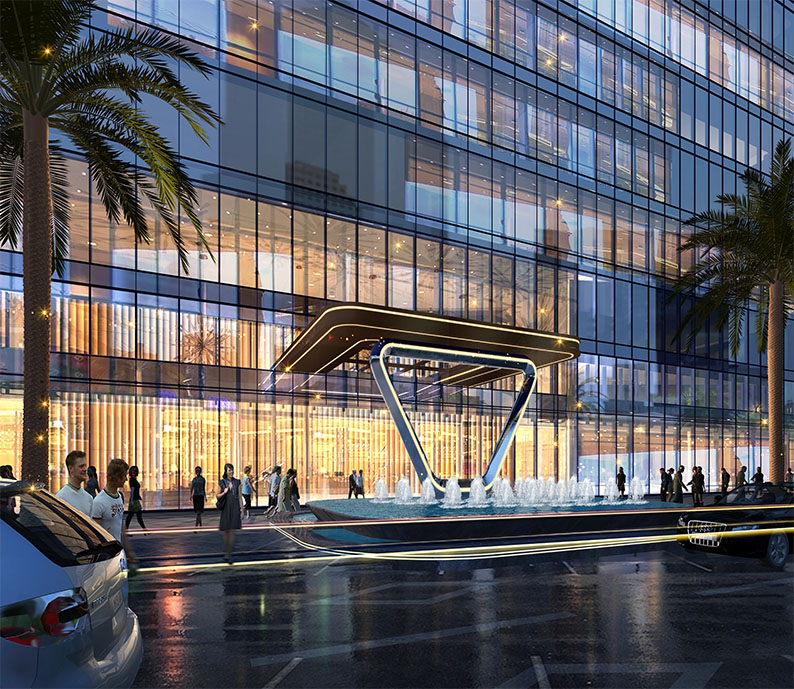 日间,玻璃幕墙反射蓝天绿树,营造轻盈通透感;夜间,室内暖光透过玻璃,化作城市夜景里的璀璨切片。入口处独特造型雨棚搭配水景,成为视觉焦点,既彰显建筑的精致格调,又为访客营造迎宾仪式感。
