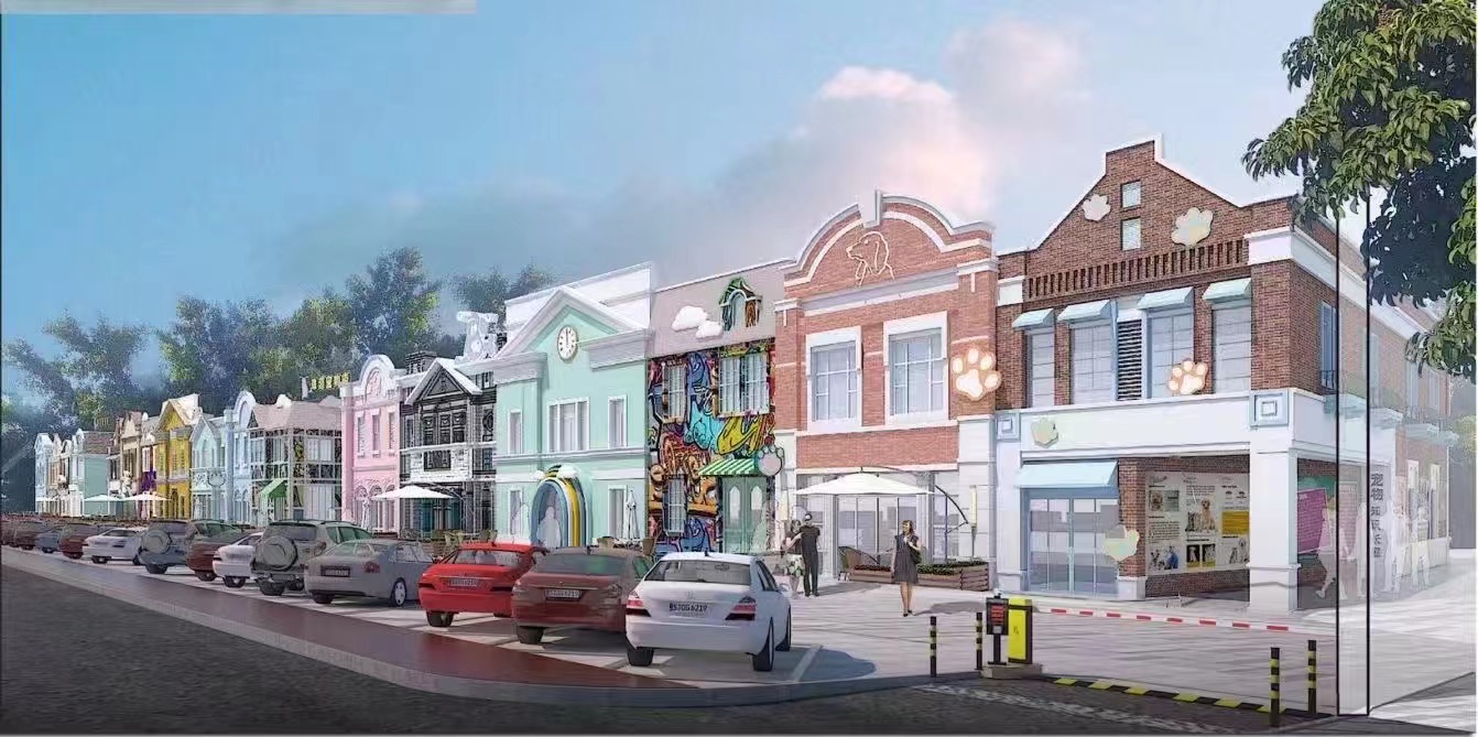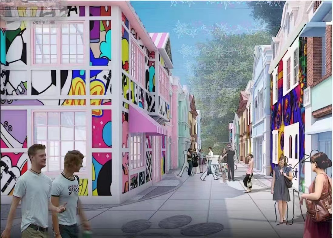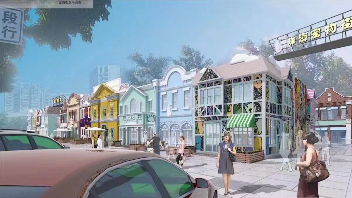 珠海宠物街旧改设计,以 “萌趣、活力、多元” 为核心理念,重塑街区风貌。建筑外观摒弃陈旧,采用马卡龙色系与复古风格融合,粉、蓝、黄等色彩明快跳跃,搭配宠物爪印、动物轮廓等装饰元素,呼应宠物主题 。