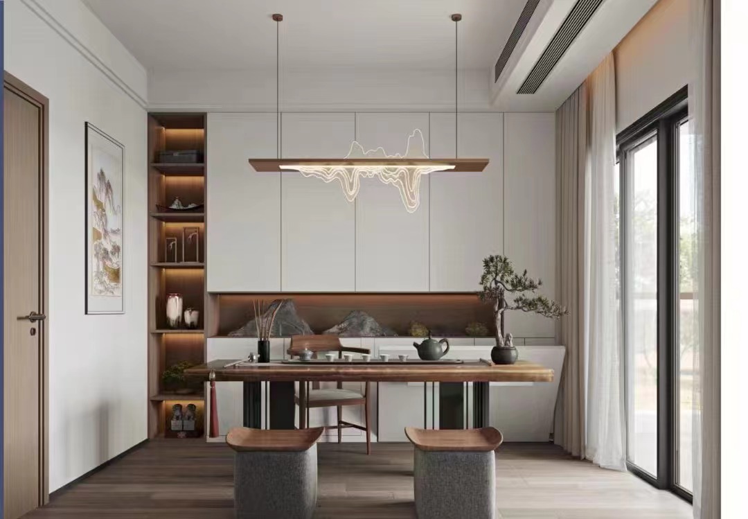 茶室区域延续简约雅致,山水造型吊灯呼应墙面挂画,定制柜体藏露结合,陈列茶具与文玩;原木茶台搭配简约座椅,一侧微缩假山、盆景,将东方意境融入日常,在这里,可品茗赏景,享受静谧的中式生活美学 。整体设计通过材质的细腻衔接、色彩的柔和过渡,以及功能区的合理布局,打造出既适配现代生活,又饱含文化底蕴的别墅居所,诠释高端人居的多元可能 。