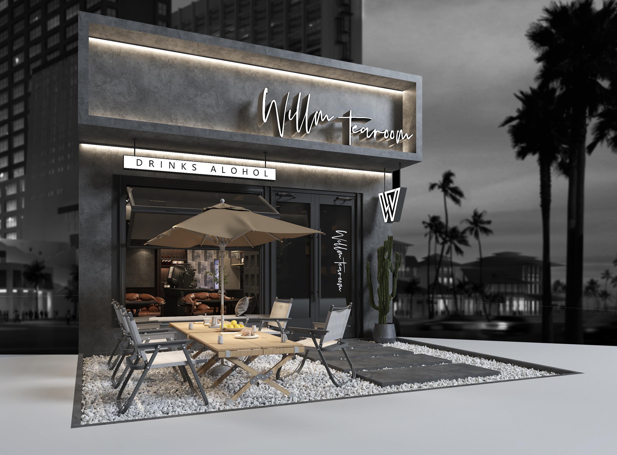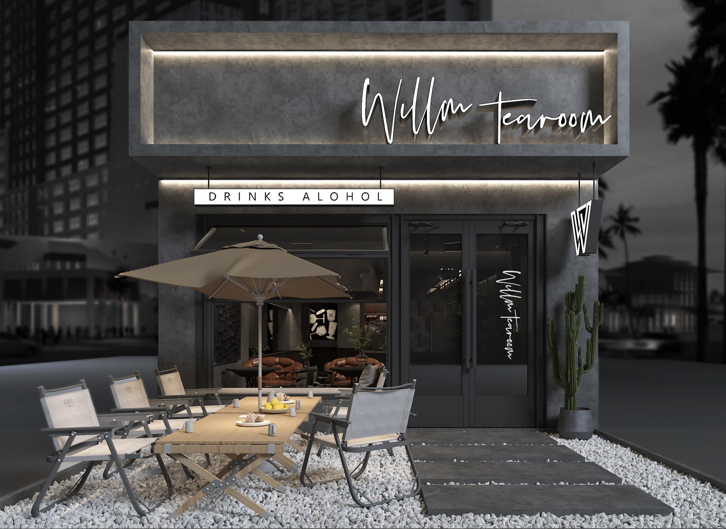 Willm Tearoom 饮品店设计,以 “工业风融合休闲氛围” 为理念,打造都市中的惬意角落。建筑外观采用清水混凝土材质,呈现质朴的灰色调,搭配精致的白色艺术字体招牌 “Willm Tearoom”,下方 “DRINKS ALOHOL” 标识明确业态,简约又具辨识度 。
