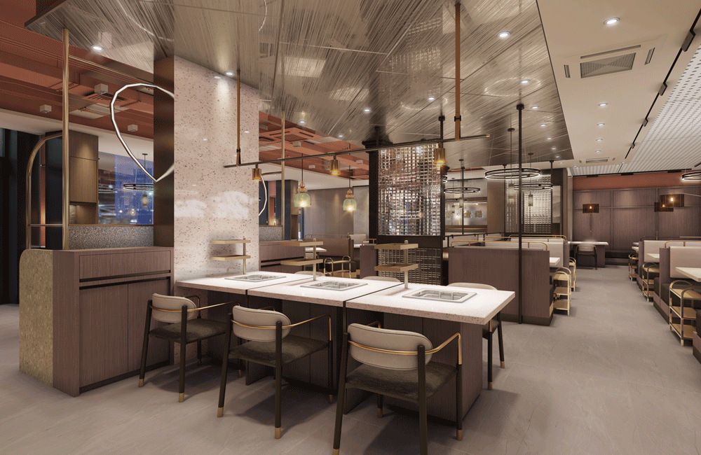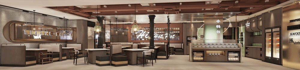 开放式布局让空间通透,卡座与散台结合,满足不同聚餐需求。“小料台” 区域设计简洁实用,食材陈列清晰;特色区域以独特造型隔断划分,既保证私密性,又增添空间层次。金属、木质、石材等材质混搭,在硬朗中融入细腻,让食客在工业风的粗犷与精致感的交融里,沉浸式享受火锅美味,打造出区别于传统火锅店的时尚用餐场景 。