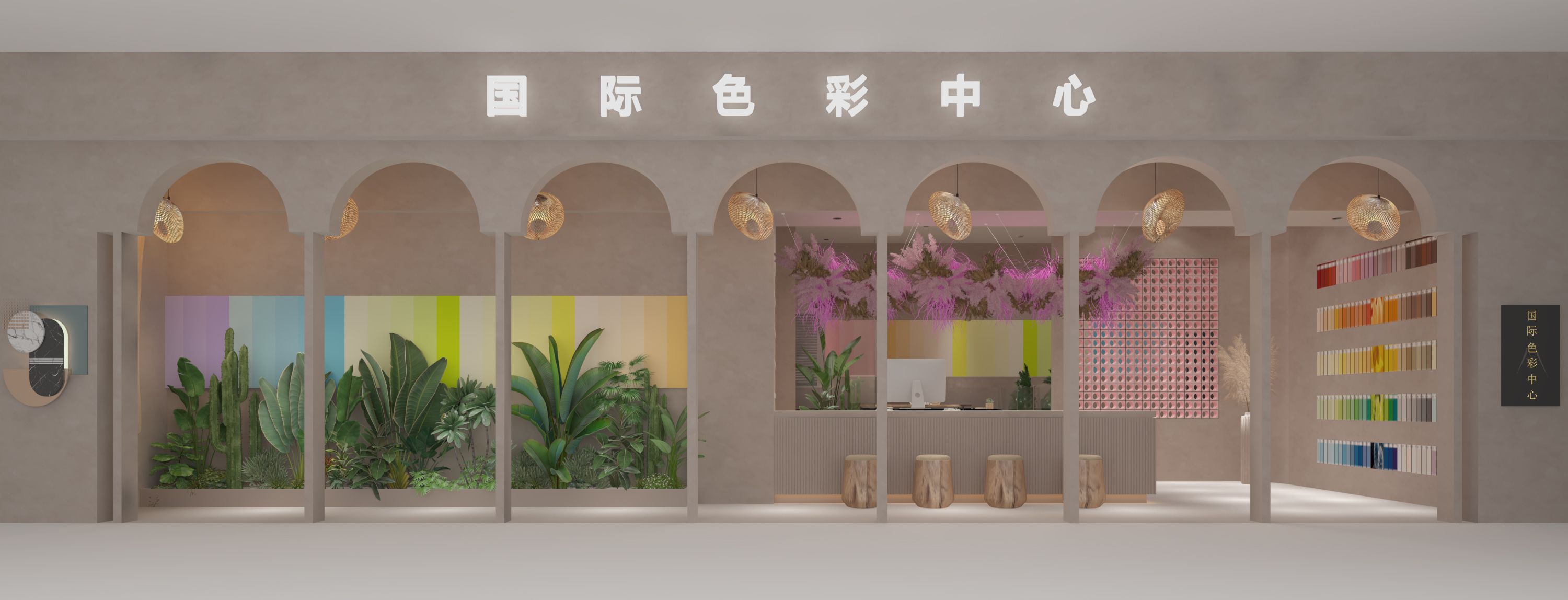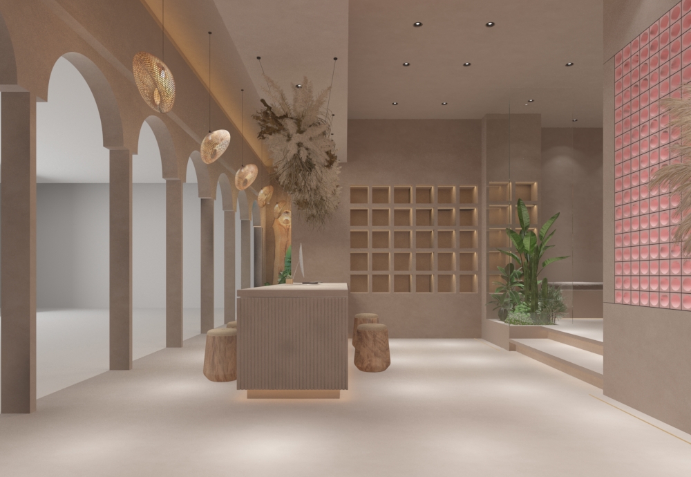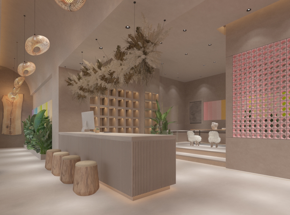 入口处,拱形门廊序列营造仪式感,镶嵌的彩色艺术涂料墙与绿植共生,如打开色彩与自然交织的 “任意门”;接待区,质朴的木质吧台搭配原木墩座椅,上方垂坠的艺术花艺装置,模糊空间边界,传递自然艺术张力。