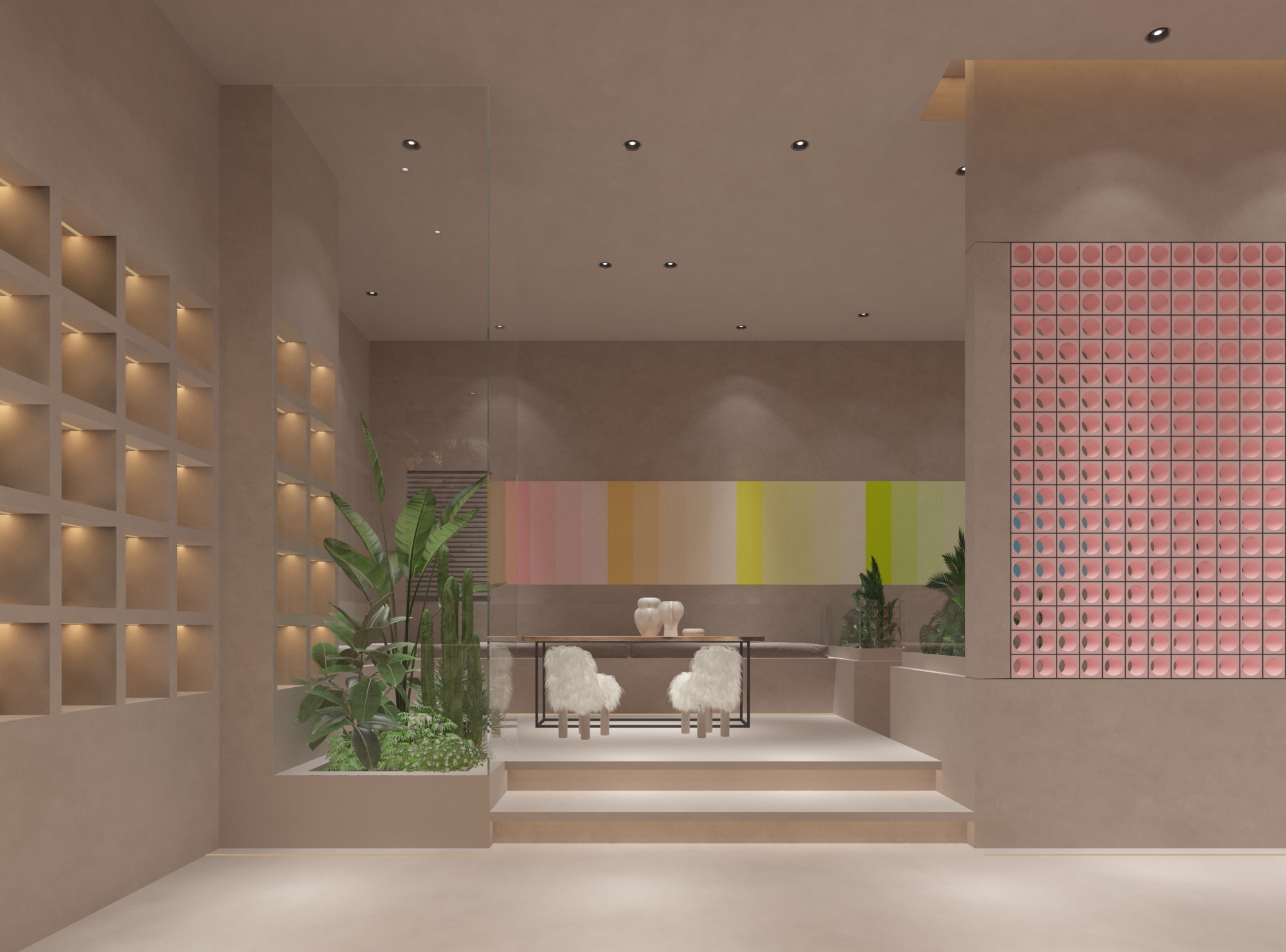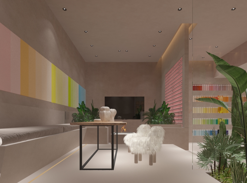 展示区中,艺术涂料以渐变墙、立体模块等形式呈现,搭配绿植造景与艺术陈设,让色彩成为空间主角,讲述从自然汲取灵感的涂染故事;休闲洽谈区,围合式布局与暖光设计,营造沉浸式交流场景,使参观者在自然与色彩的对话中,深度感知艺术涂染的美学价值与工艺温度,打造区别于传统展厅的诗意体验场域 。