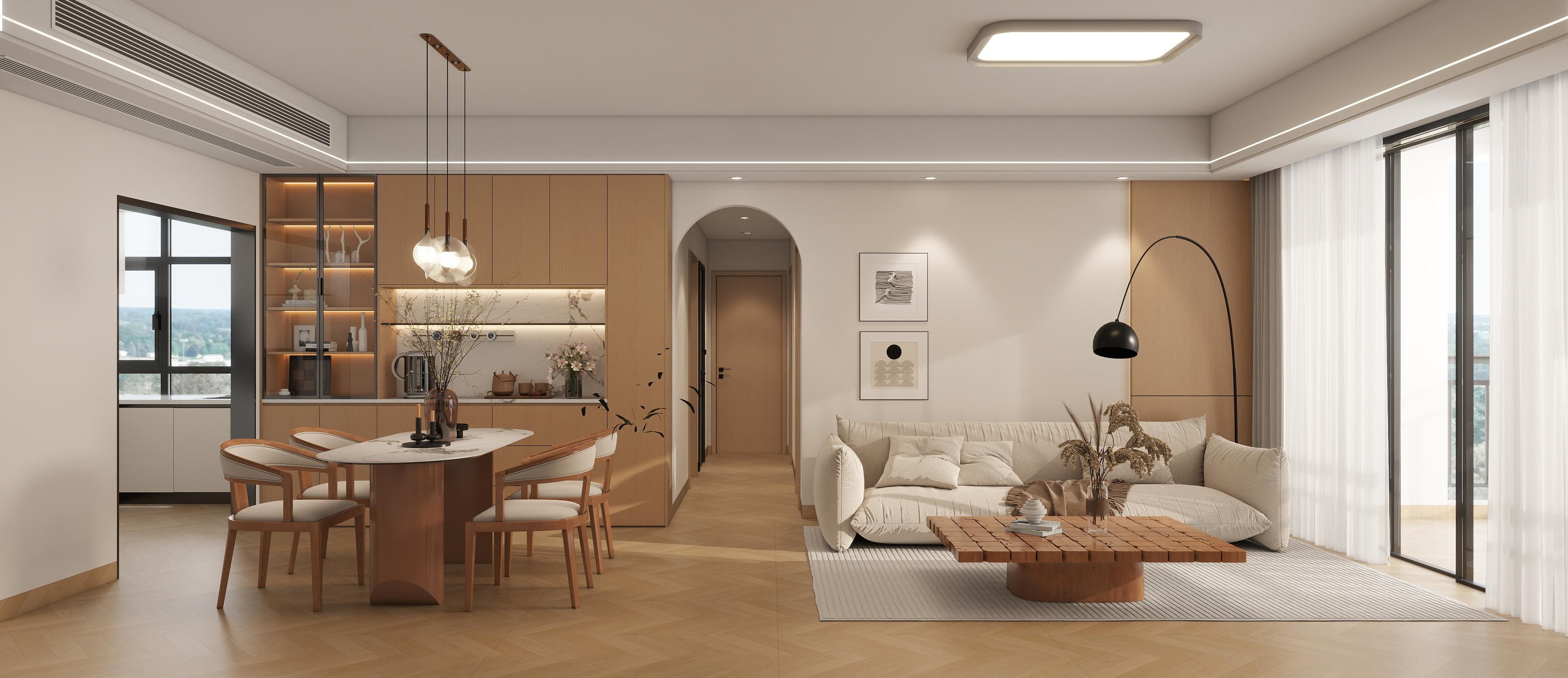 客餐厅连通设计,浅木色人字拼地板延伸空间感。客厅墙面为柔和白色,搭配浅木色茶几与简约白色沙发,营造轻松氛围。电视背景墙做简洁造型,嵌入收纳格,摆放装饰与书籍,增添生活气息。餐厅区域,浅木色餐桌配同色系餐椅,上方悬简约吊灯,与客厅互动,适配家庭聚餐、休闲交流,大面积采光让空间更显通透明亮 。