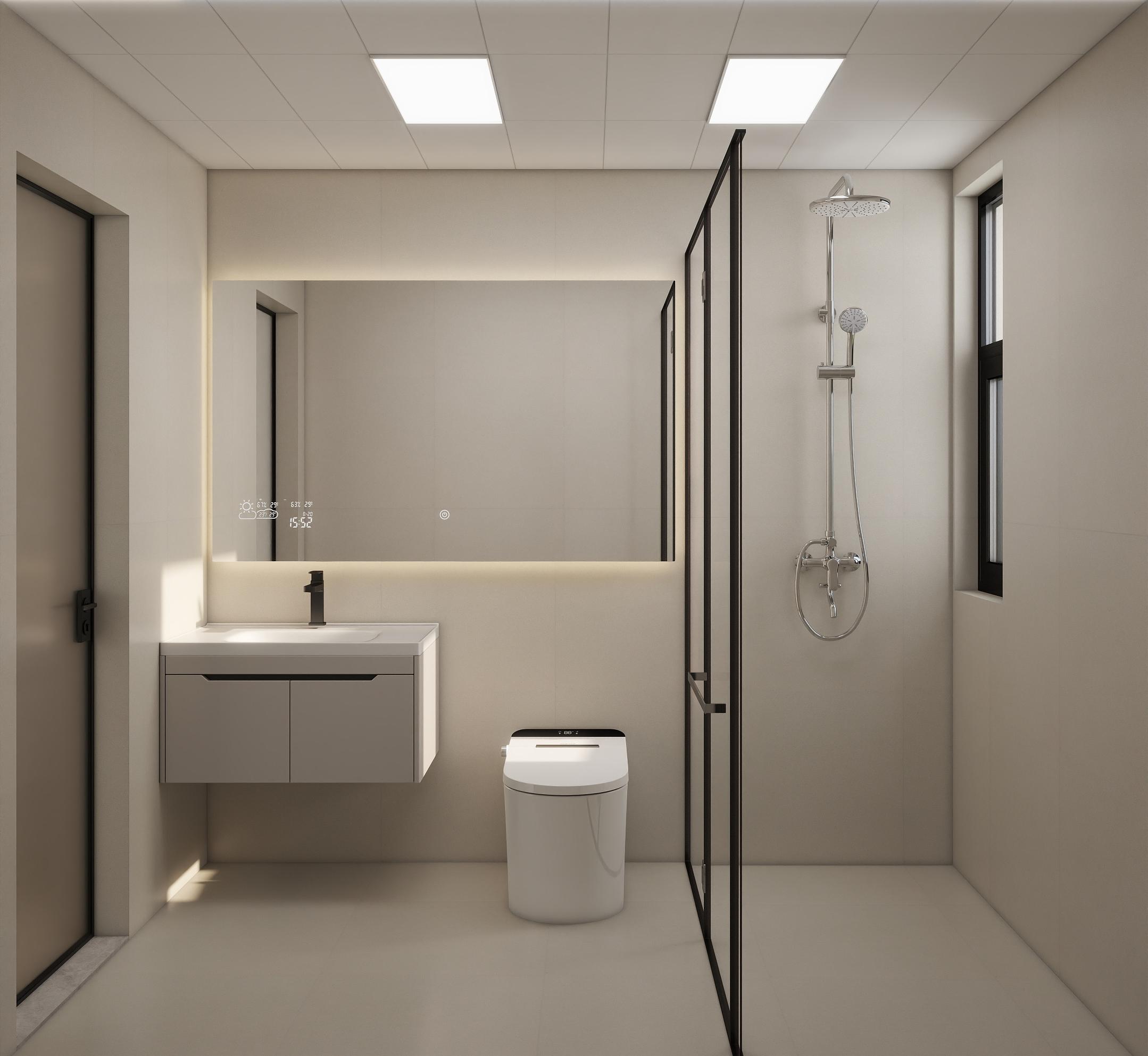 卫生间用浅色调瓷砖,搭配黑色金属淋浴隔断,形成简洁对比。浅木色浴室柜呼应整体风格,智能马桶提升便捷性,镜柜灯带增强温馨感,让卫浴空间在实用基础上,融入轻原木风的自然质感,适配滨海居所的精致生活需求 。