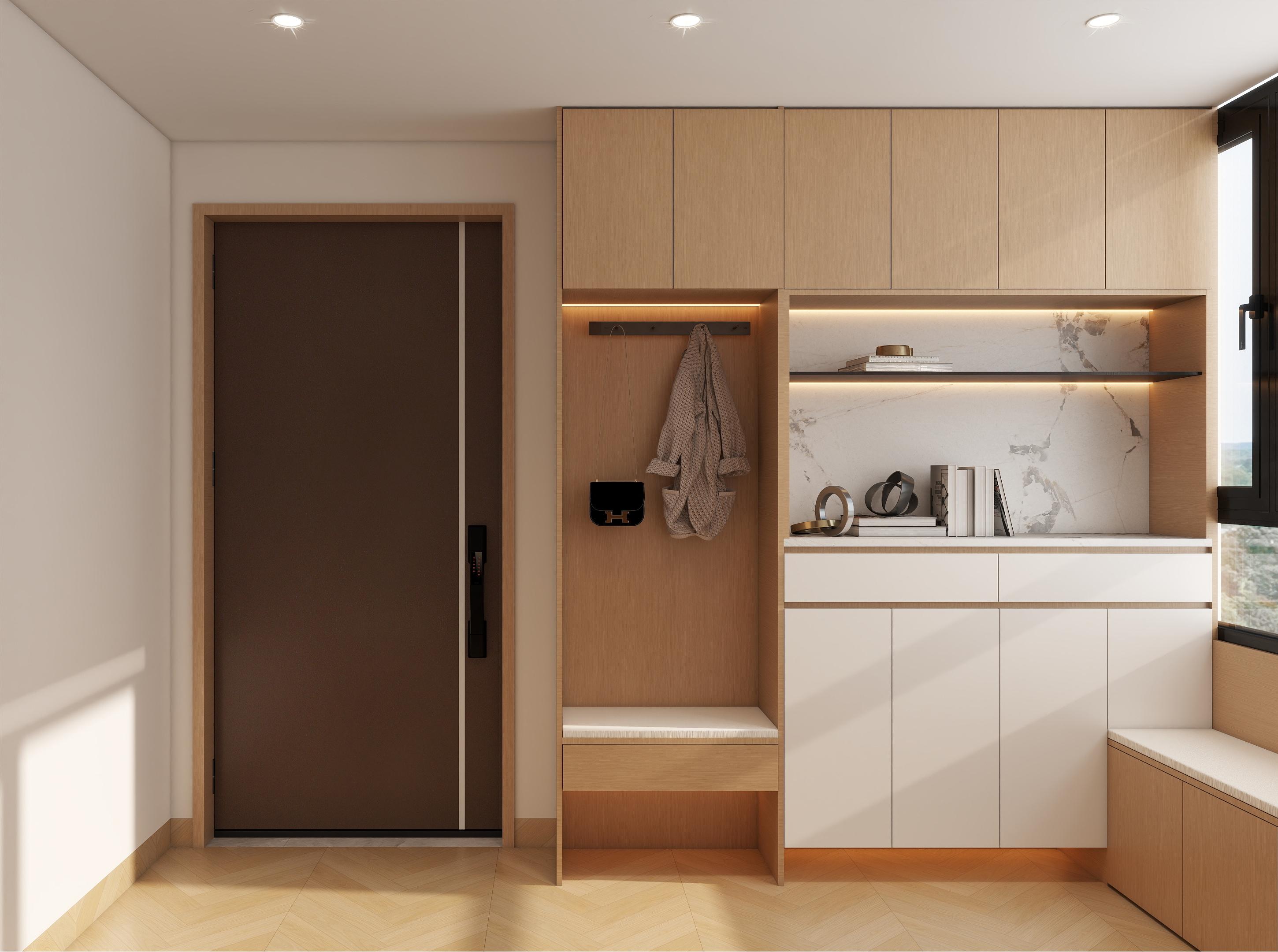 入户以浅木色为主调,定制一体化玄关柜。柜体结合开放格与封闭柜,开放格嵌入灯带,方便放置常用小物件;封闭柜满足鞋子、杂物收纳,底部留空可暂放常穿鞋。浅木材质自然温润,搭配简洁线条,营造出温馨且有序的归家第一印象,开启轻原木风的舒适体验 。
