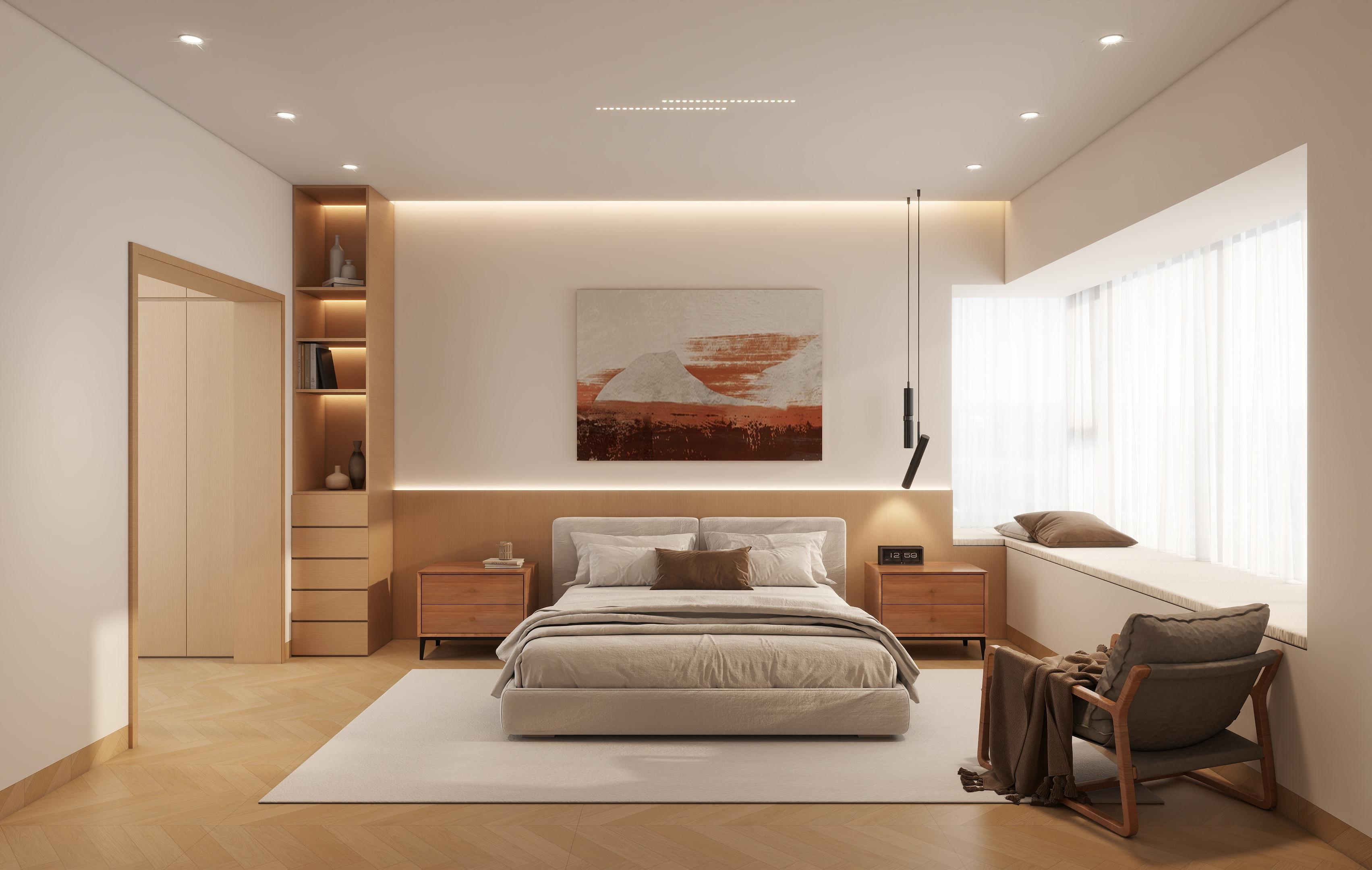 主卧延续轻原木风,浅木色地板、白色墙面构建宁静基底。定制浅木色衣柜与床头背景墙一体设计,衣柜内置灯带,收纳与装饰兼具。床头挂简约艺术画,搭配浅灰床品,温馨有格调。角落设休闲椅与边几,打造私密阅读角,让业主在滨海居所中,享受自然原木带来的静谧休憩时光 。