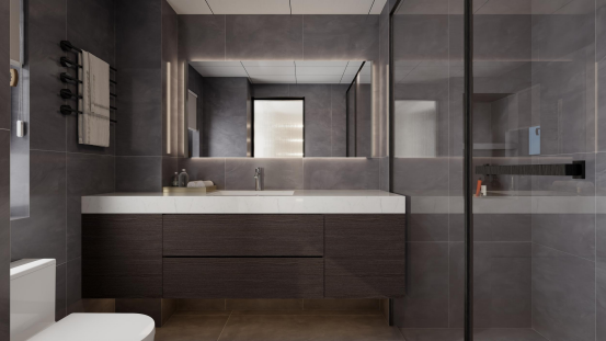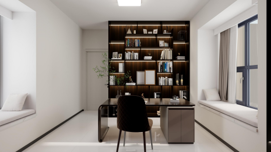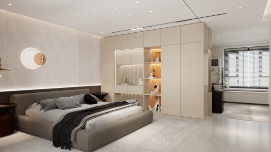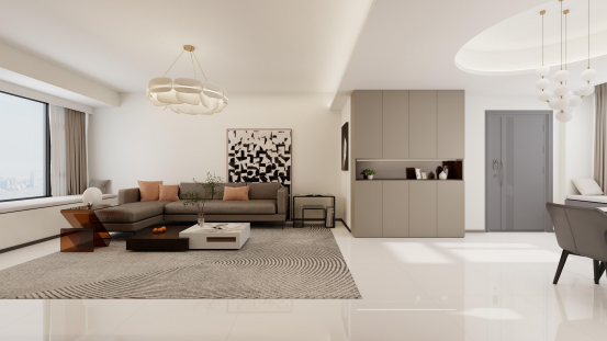 本项目客厅以低饱和度色彩营造温馨氛围,地面至墙面的精心设计尽显细节品质。大面积窗户引入自然光,搭配简洁吊顶,整体明亮通透。家具与软装的搭配和谐,从地面延伸到墙面再到天花的每一步设计,都展现出对细节和品质的极致追求,营造出舒适宜人的居住氛围。
