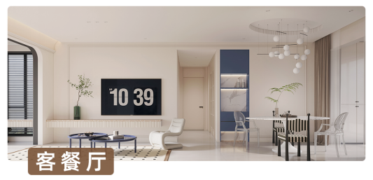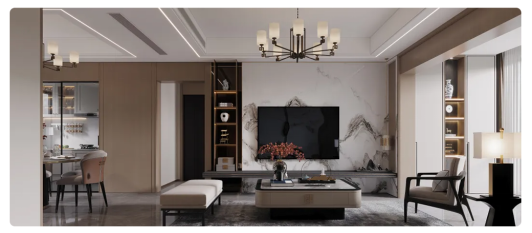 客餐厅一体化设计,挑高天花板以直线吊顶搭配回纹雕花装饰,中央悬挂青铜质感吊灯。客厅主墙以整幅水墨山水硬包为背景,两侧摆放新中式实木沙发(布艺坐垫 + 榫卯结构框架),茶几嵌入云纹铜饰。餐厅区域配置圆形黑檀木餐桌,桌面镶嵌贝壳拼花,上方吊灯复刻宫灯形制,与客厅形成 “方与圆” 的哲学呼应,落地窗引入园林景观,实现 “室内即画境” 的大宅气度。