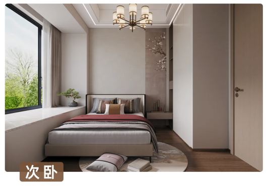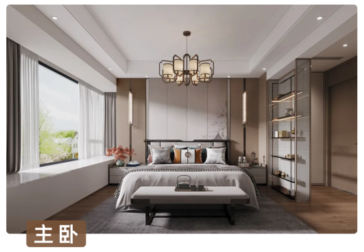 主卧以 “极简山水” 为设计语言,背景墙采用水墨淡彩硬包,搭配两侧胡桃木格栅,中央悬挂苏绣山水屏风。2.2 米实木大床搭配真皮软包床头,两侧设带抽屉的极简床头柜,飘窗保留全景采光,定制胡桃木飘窗柜兼具收纳与坐榻功能。步入式衣帽间内增设中式博古架,陈列瓷器与文玩,玻璃柜门与木质框架结合,既展示藏品又保持空间通透。
