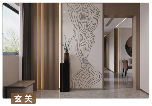 玄关以 “天圆地方” 为设计逻辑,鞋柜采用多层胡桃木隔板,满足不同鞋履收纳需求,底部留空便于放置常穿鞋。右侧设定制换鞋凳,坐垫覆以米色丝绒,墙面悬挂水墨山水挂画,旁置青瓷花瓶插放翠竹,地面铺陈黑白相间的仿古砖拼花,进门即见 “移步换景” 的东方仪式感。