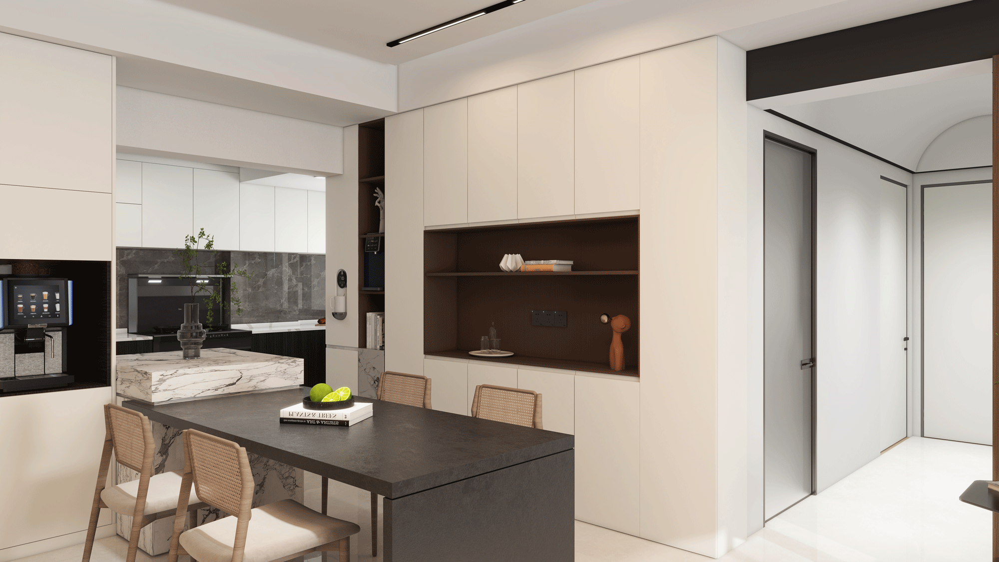 开放式餐厨区以深灰岛台为核心,搭配藤编餐椅,天然材质增添温馨感。岛台兼具备餐、社交功能,后方浅白柜体嵌入深棕展示格,陈列书籍与艺术小物,延伸客厅的文化氛围。与客厅贯通的格局,让家庭互动更流畅,适配聚餐、下午茶等多元场景,诠释现代简约的 “功能美学”。