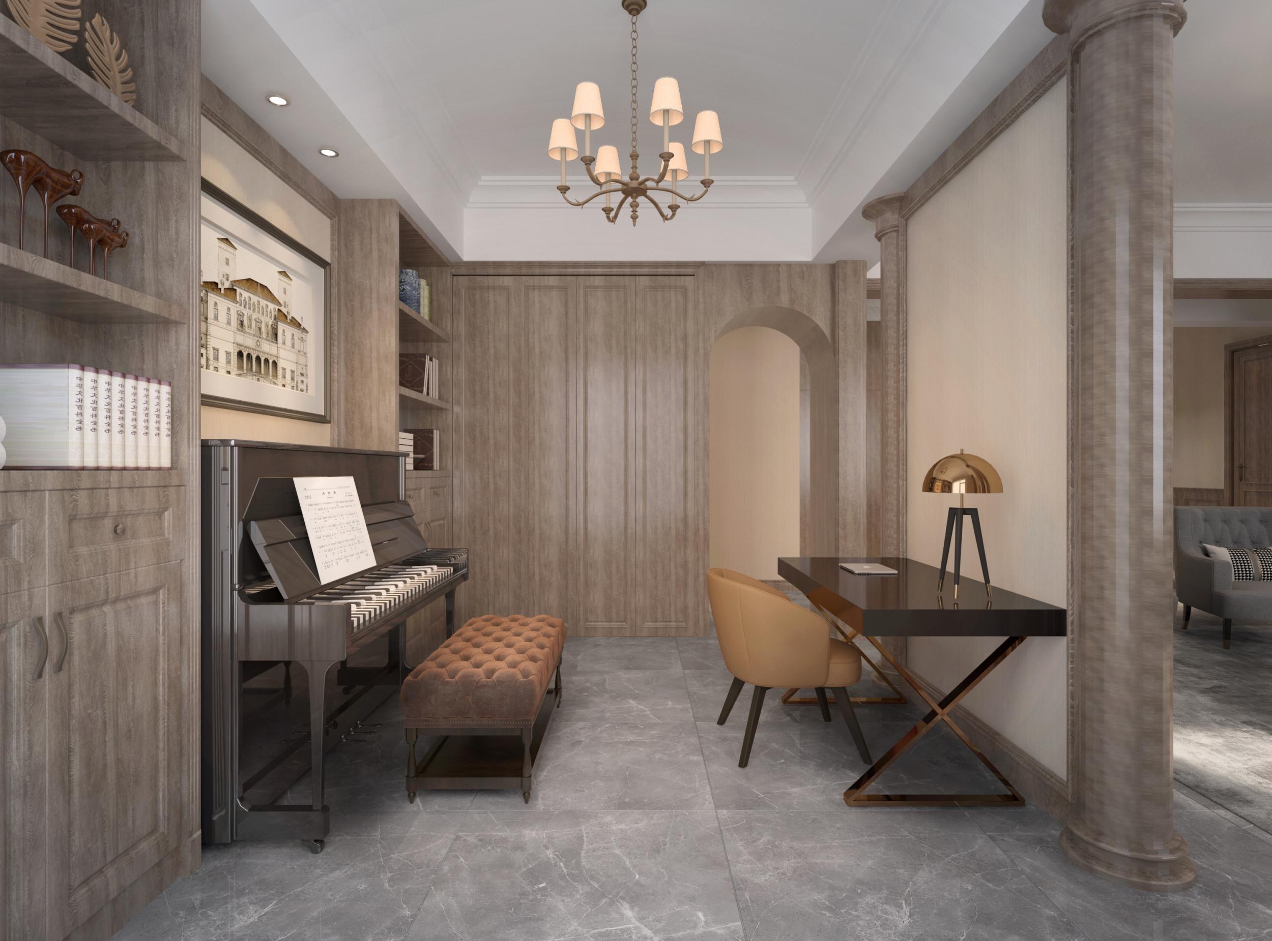 琴房与书房融合区,实木护墙板、复古吊灯奠定美式基调。三角钢琴与皮质琴凳,满足艺术创作需求;深木书桌搭配焦糖色座椅,适配阅读办公。墙面挂画与陈列架,将家庭文化藏品融入空间,打造 “传承与成长” 并存的精神场域。