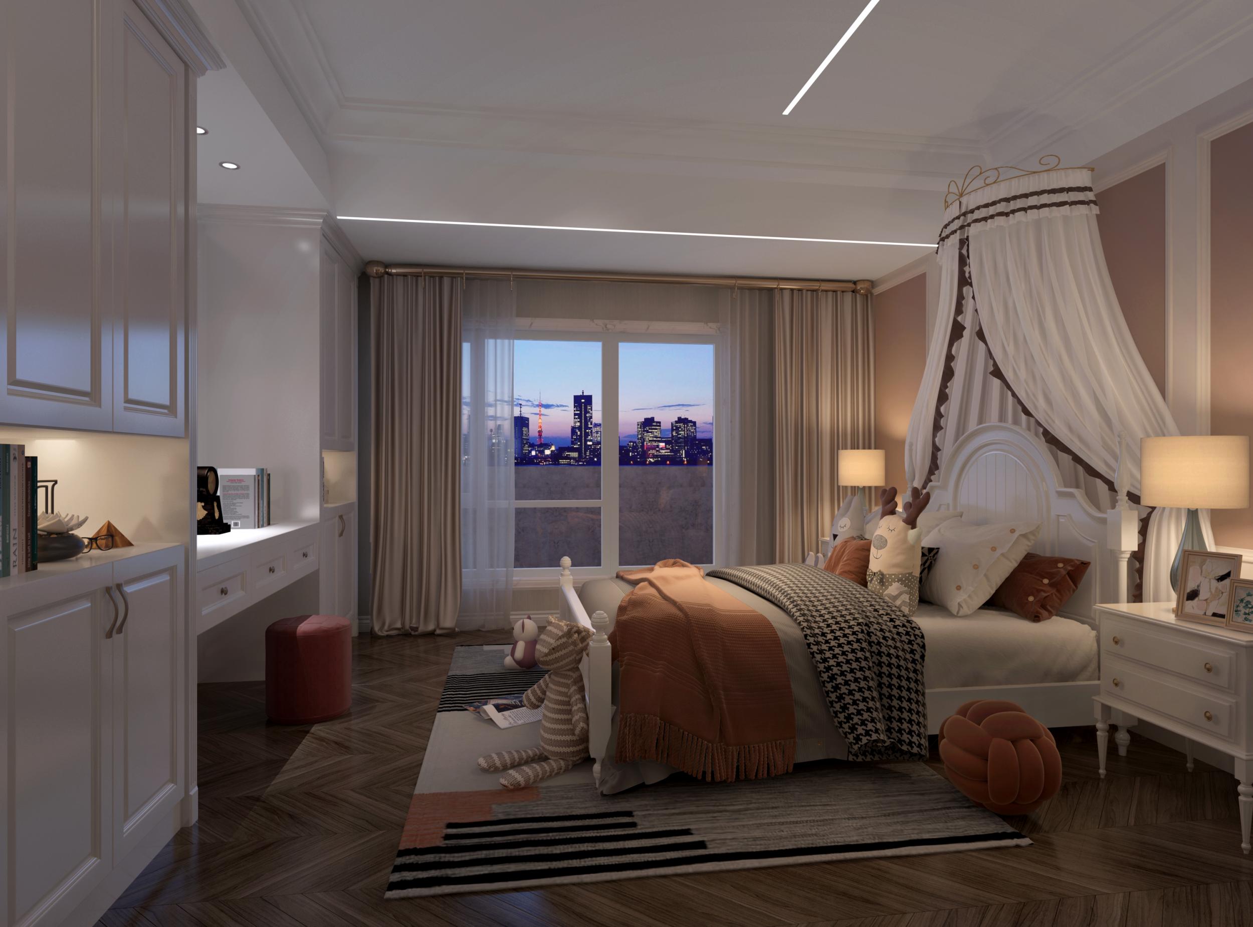 儿童房以柔和粉棕为主,四柱床搭配纱幔,营造美式童话氛围。定制书桌与储物柜满足成长需求,拼接地毯、玩偶摆件注入童趣。大窗保留滨海观景,让孩子的成长空间在美式优雅中,充满自然与梦幻感。