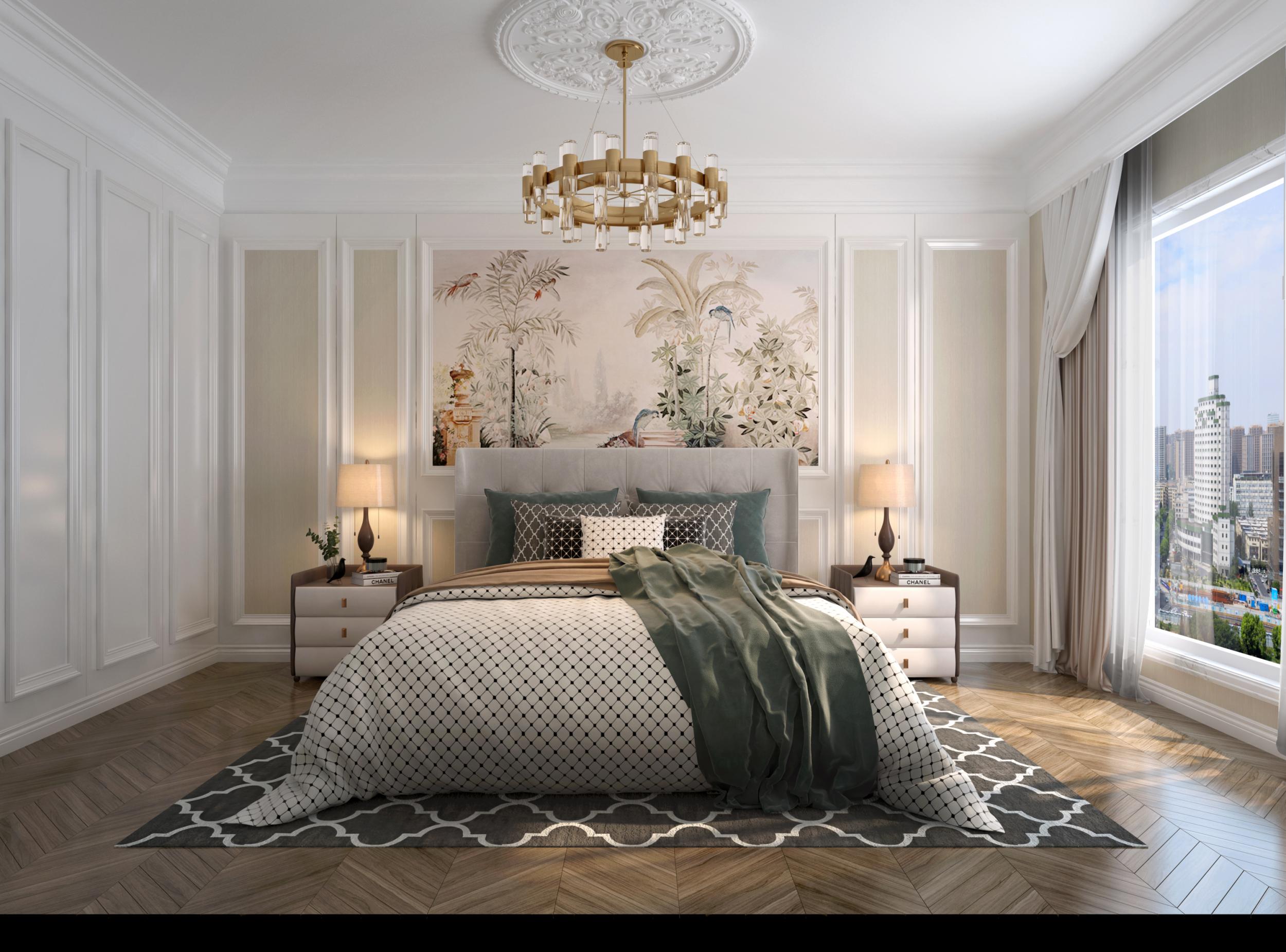 主卧以护墙板、雕花吊顶强化美式基因,大幅植物壁画增添自然意趣。软包床头搭配格纹床品、墨绿色盖毯,碰撞出复古优雅。双侧床头柜与壁灯营造对称美感,落地窗将城市景观引入,让睡眠空间在美式精致中,兼具滨海生活的开阔视野。