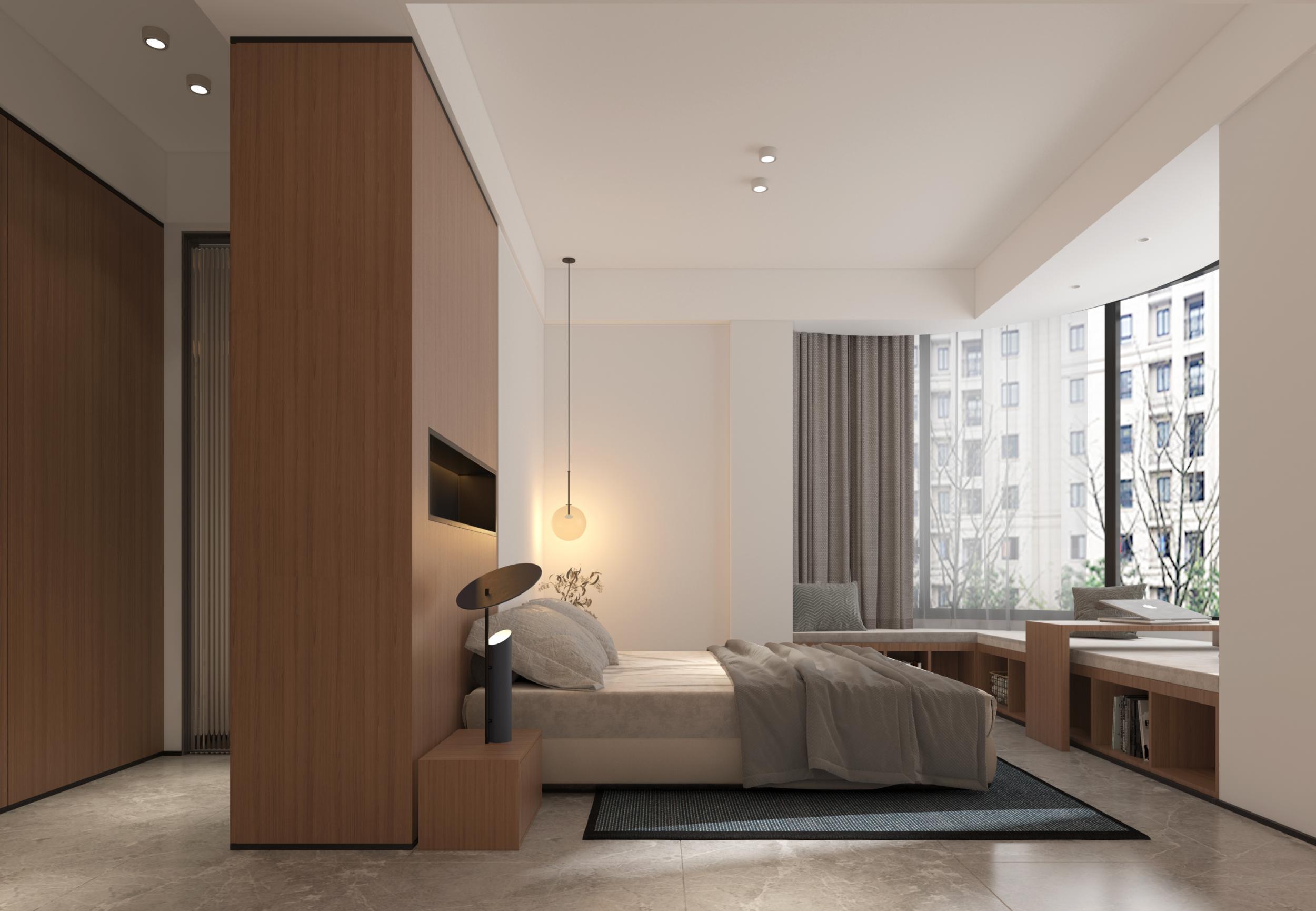 主卧以木色隔断划分空间,营造中式 “藏与露” 的层次。悬浮 bedside table、简约吊灯强化现代线条,浅灰床品传递静谧。弧形窗引入滨海光线,飘窗阅读区融合中式 “闲读” 意趣,让休憩空间在现代舒适中,透着东方生活的雅致慢调。