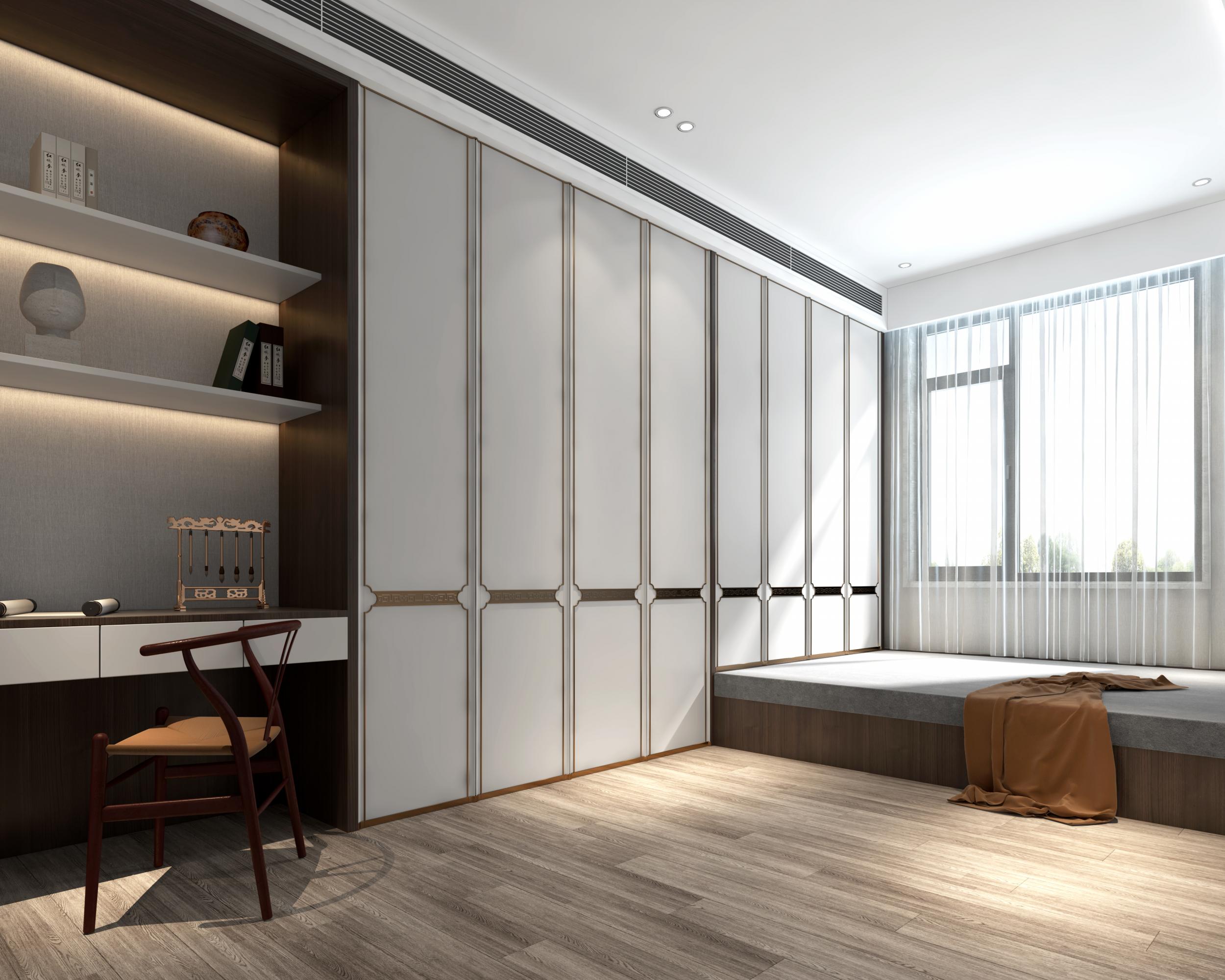 次卧以浅灰木质、米白墙面构建空间,定制衣柜融入中式线条,兼具实用与美观。书桌与榻榻米一体化设计,满足居住者休憩与工作需求,开放式书架陈列书籍与中式摆件,传递文化底蕴。柔和灯光营造宁静氛围,诠释现代中式风格在次卧的 “多元适配” 与 “细节见禅意”。