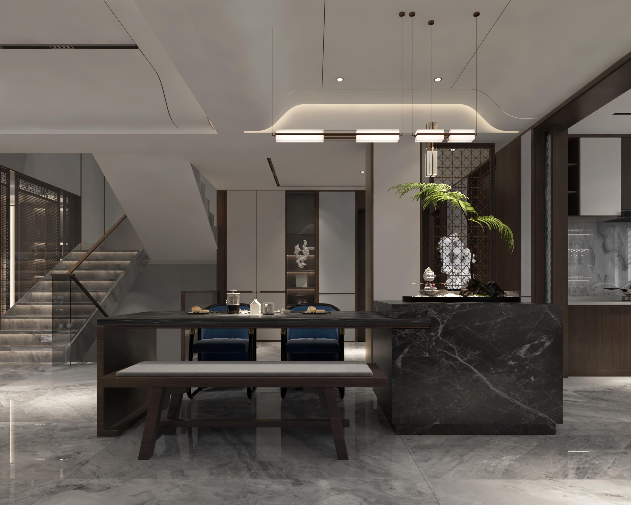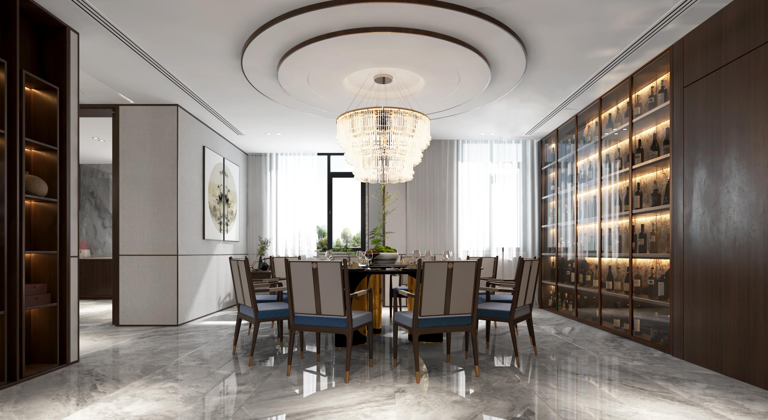 餐厅采用现代中式设计,深棕木质餐桌搭配蓝色餐椅,大理石中岛台纹理独特,与空间色调呼应。图 4 中,楼梯旁隔断融入中式格栅,背景墙陈列艺术摆件,营造 “移步换景” 意境;图 5 里,圆形吊顶与水晶吊灯提升空间精致感,酒柜陈列美酒,中式挂画点缀墙面,让用餐场景兼具 “烟火气与仪式感”,诠释现代中式风格的 “雅奢交融”。