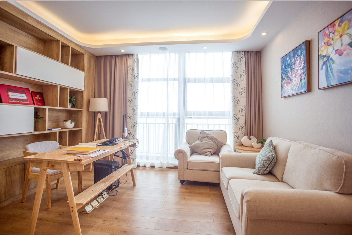 私密办公区:浅木色主导空间,木质书架与简约桌椅营造宁静专注氛围。大窗引入充足自然光,纱帘保障隐私,墙面装饰画与绿植缓解视觉疲劳。沙发区适配临时休憩与小型交流,一体化设计兼顾收纳与办公功能,助力员工深度思考、高效工作。