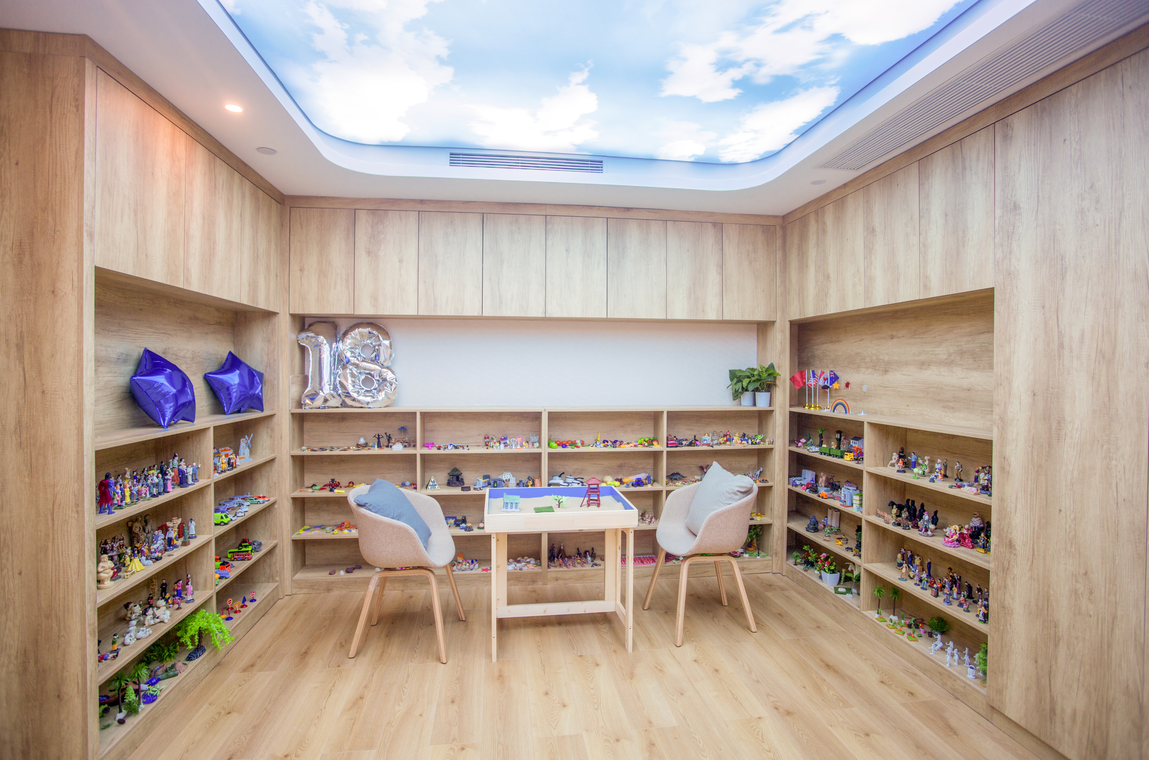 心理辅导区:三面木质书架墙陈列丰富沙盘道具,中央沙盘桌与舒适座椅构建安全交流环境。顶面蓝天白云造型舒缓情绪,大量道具为心理教学、辅导提供支撑,木质收纳墙兼具展示与实用功能,助力学员在自然轻松氛围中打开心扉,推动心理教育工作开展。