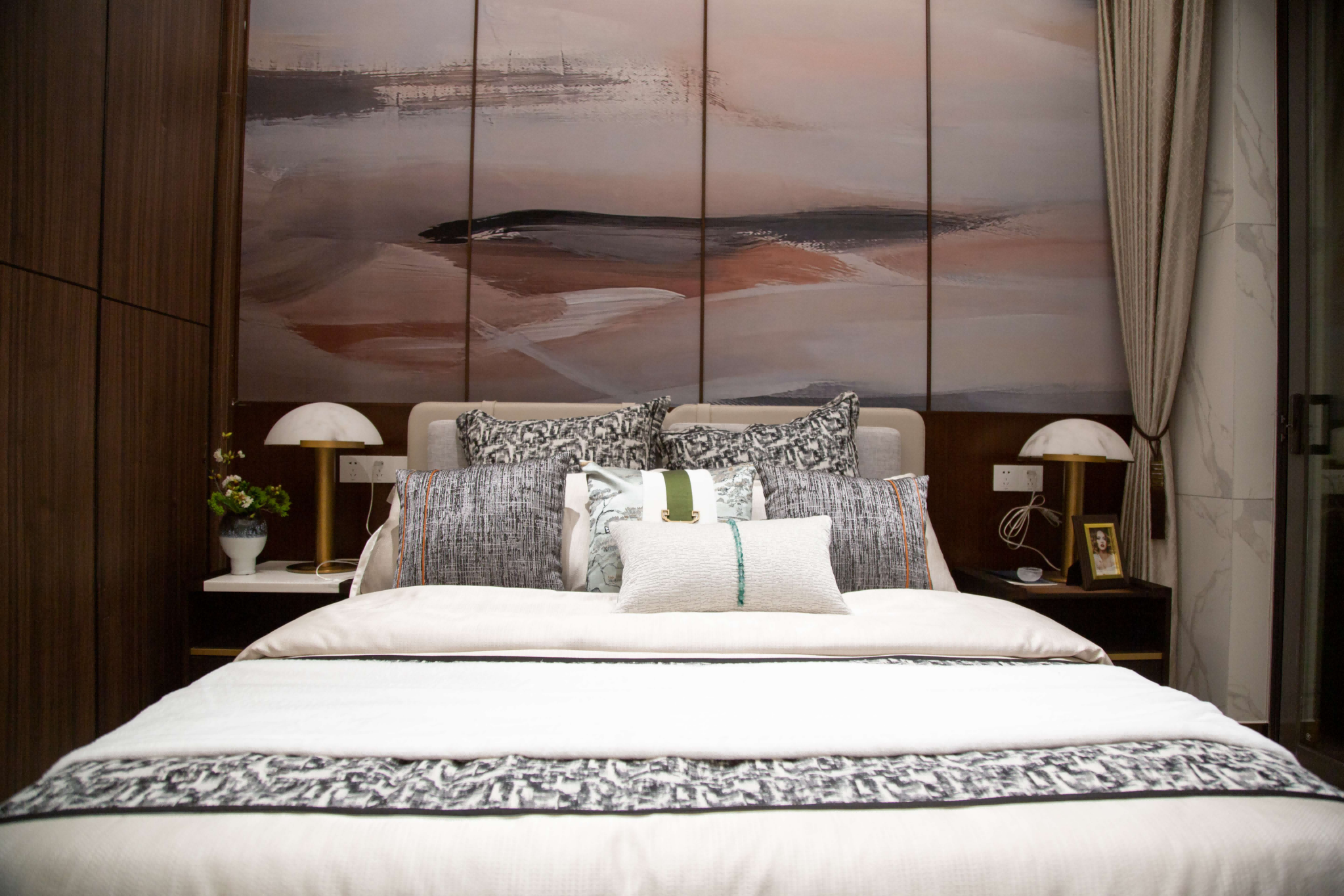 卧室延续现代轻奢调性,床头背景墙以艺术挂画 + 木质护墙板呈现,搭配对称式金色台灯,营造温馨又高级的睡眠氛围。床品选用质感面料,抱枕组合融入纹理、撞色设计,与床尾装饰毯呼应;两侧床头柜简约实用,小面积绿植点缀,让休憩空间 “轻奢不失温度,精致更显生活”。