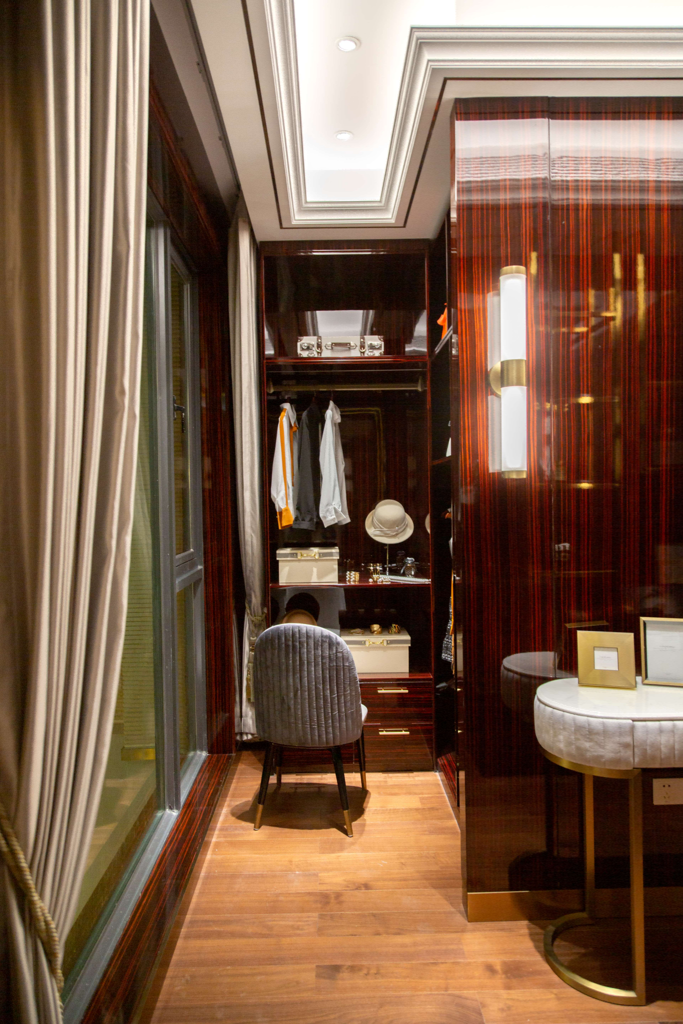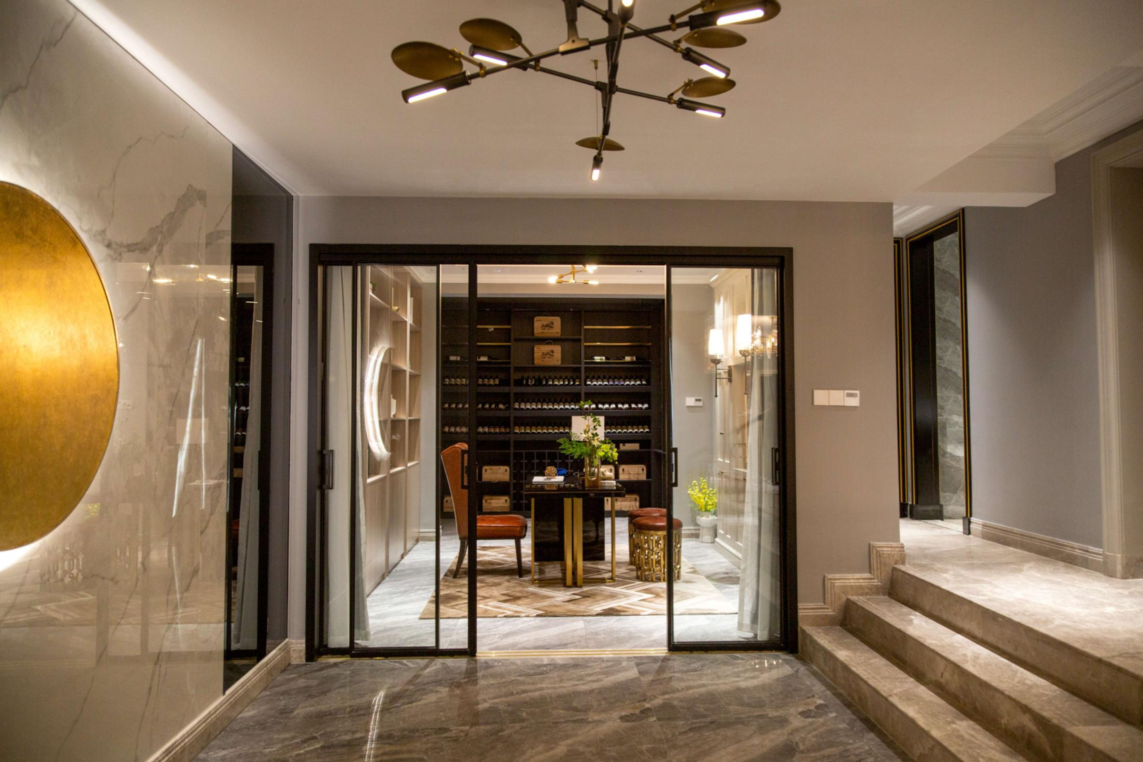 作为酒窖与别墅公共空间的过渡,前厅以灰色墙面、大理石地面打底,金色圆形装饰、金属线条勾勒轻奢细节。玻璃移门通透又具现代感,将酒窖内精致场景半遮半掩;悬浮式吊灯造型独特,下方桌椅组合适配临时交流,用 “简约框架 + 轻奢点睛”,诠释空间过渡的 “仪式感与实用性”。