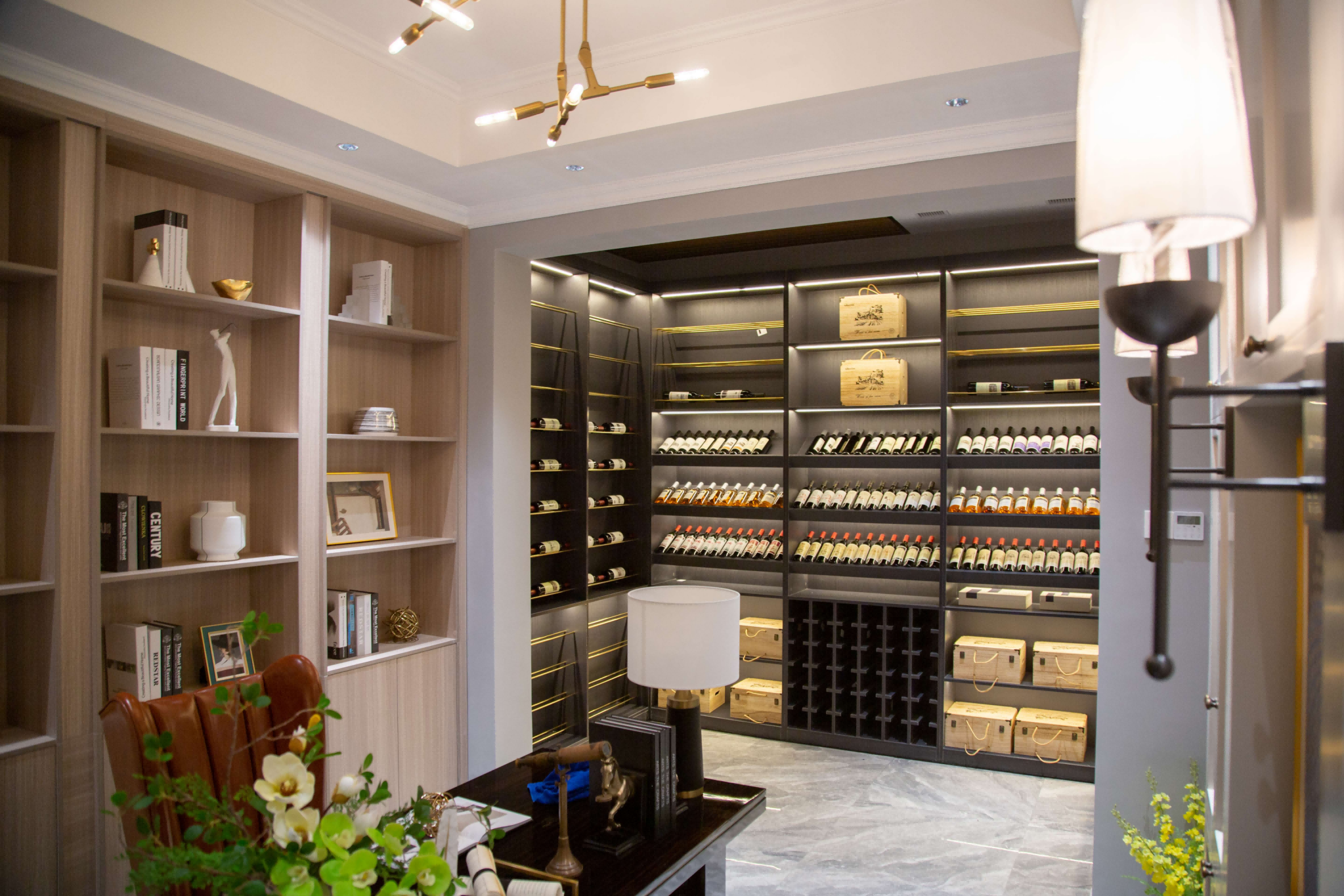 酒窖以深灰金属酒架、暖光灯带构建存储区,规整陈列红酒,展现专业与秩序;外侧品酒区则用浅木色书架、皮质座椅营造轻松氛围,金色吊灯、艺术摆件点缀其中,实现 “存储的严谨性” 与 “品酒的松弛感” 平衡,是现代轻奢风格在功能区的精致延伸,满足藏酒、社交双重需求。