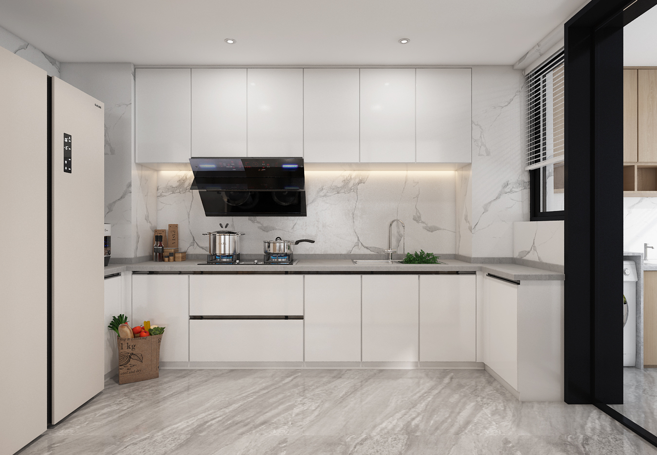 厨房延续现代简约风格,白色橱柜搭配大理石纹理墙面,简洁又显质感。“L” 型布局适配操作流程,上方吊柜、下方地柜 + 抽屉满足收纳需求;嵌入式烟机、简约灶具强化空间整洁感,地面蔬菜篮增添生活气息,用 “实用设计 + 简约美学”,打造 “高效又美观” 的烹饪场域。