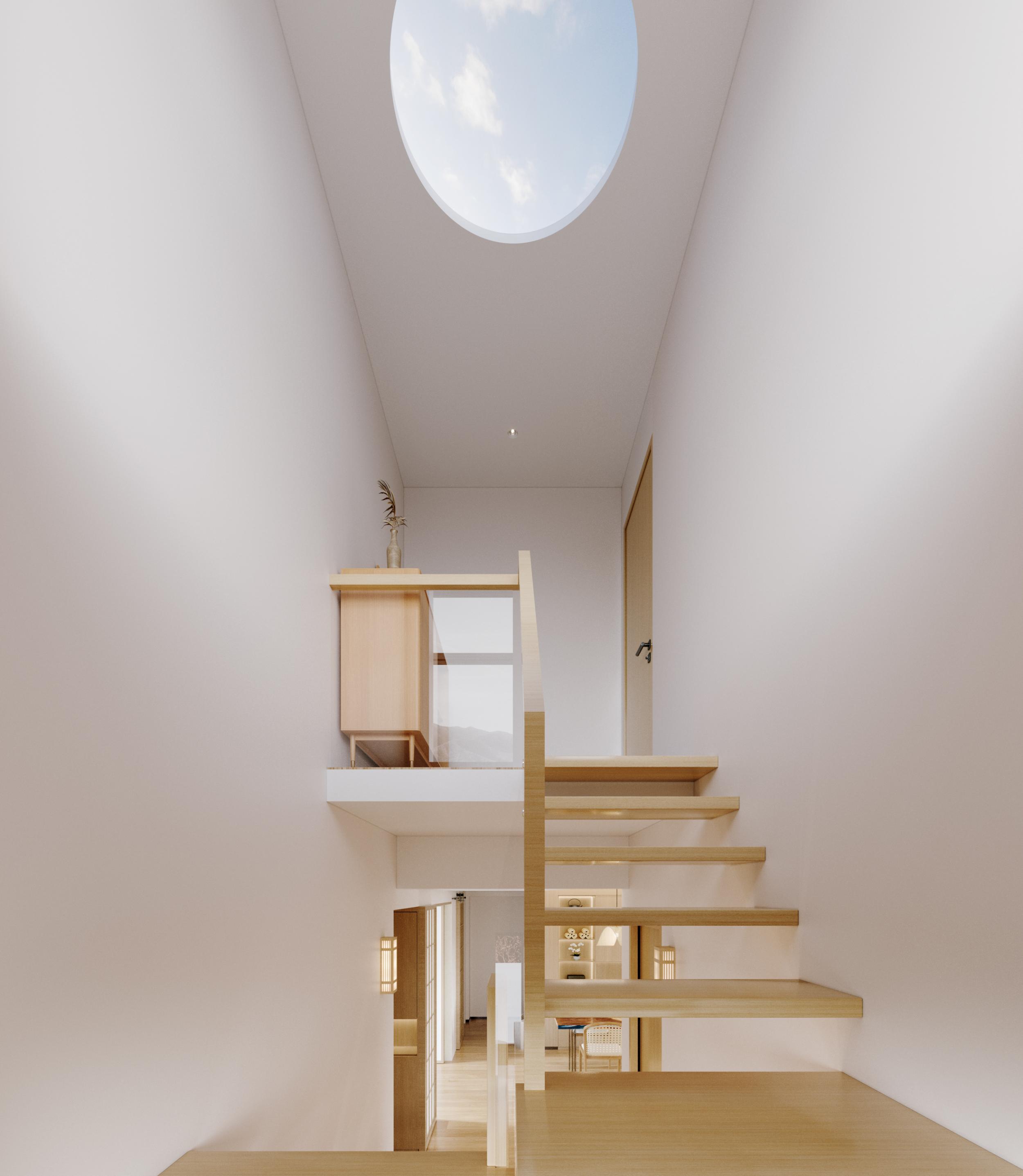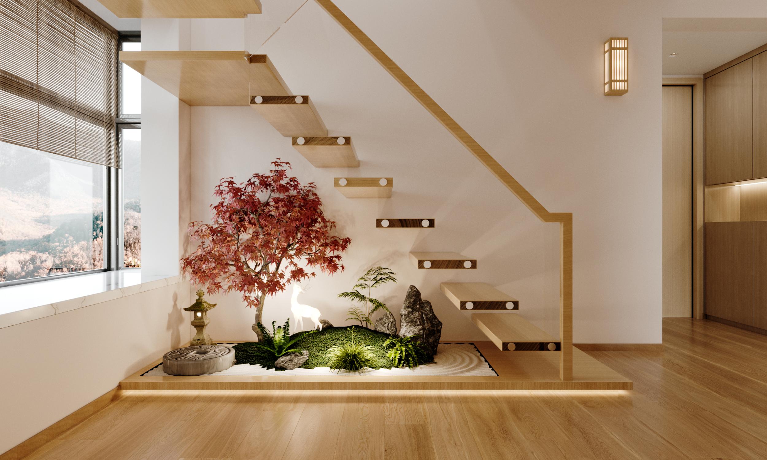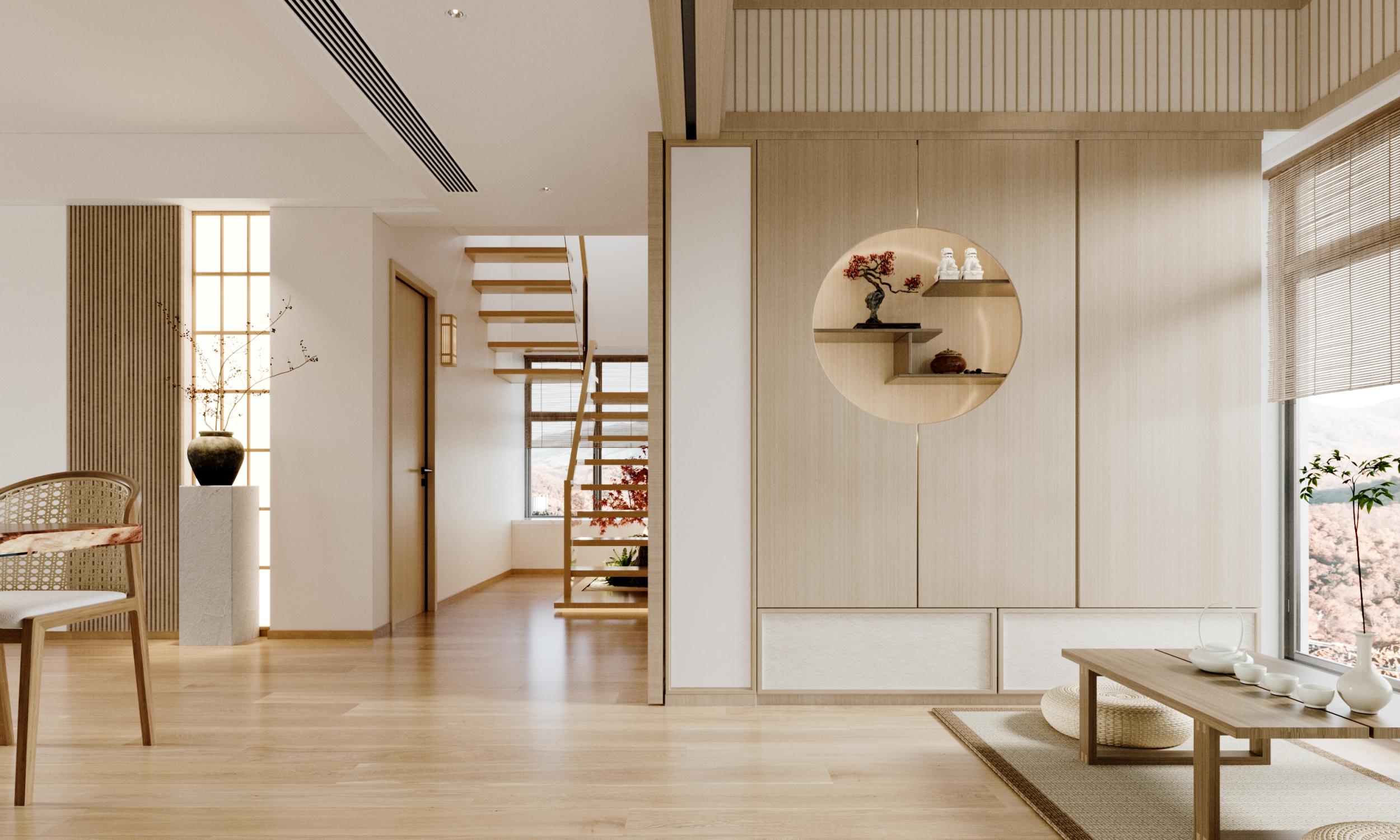 作为两层过渡区域,楼梯间以白色墙面、浅木色楼梯为基础,圆形天窗引入自然光线,缓解压迫感。楼梯旁设简约柜体与绿植点缀,让过渡空间兼具收纳与装饰功能,用简洁设计 + 自然元素,诠释日式风格在垂直交通区的延伸,带来 “步移景异” 体验。