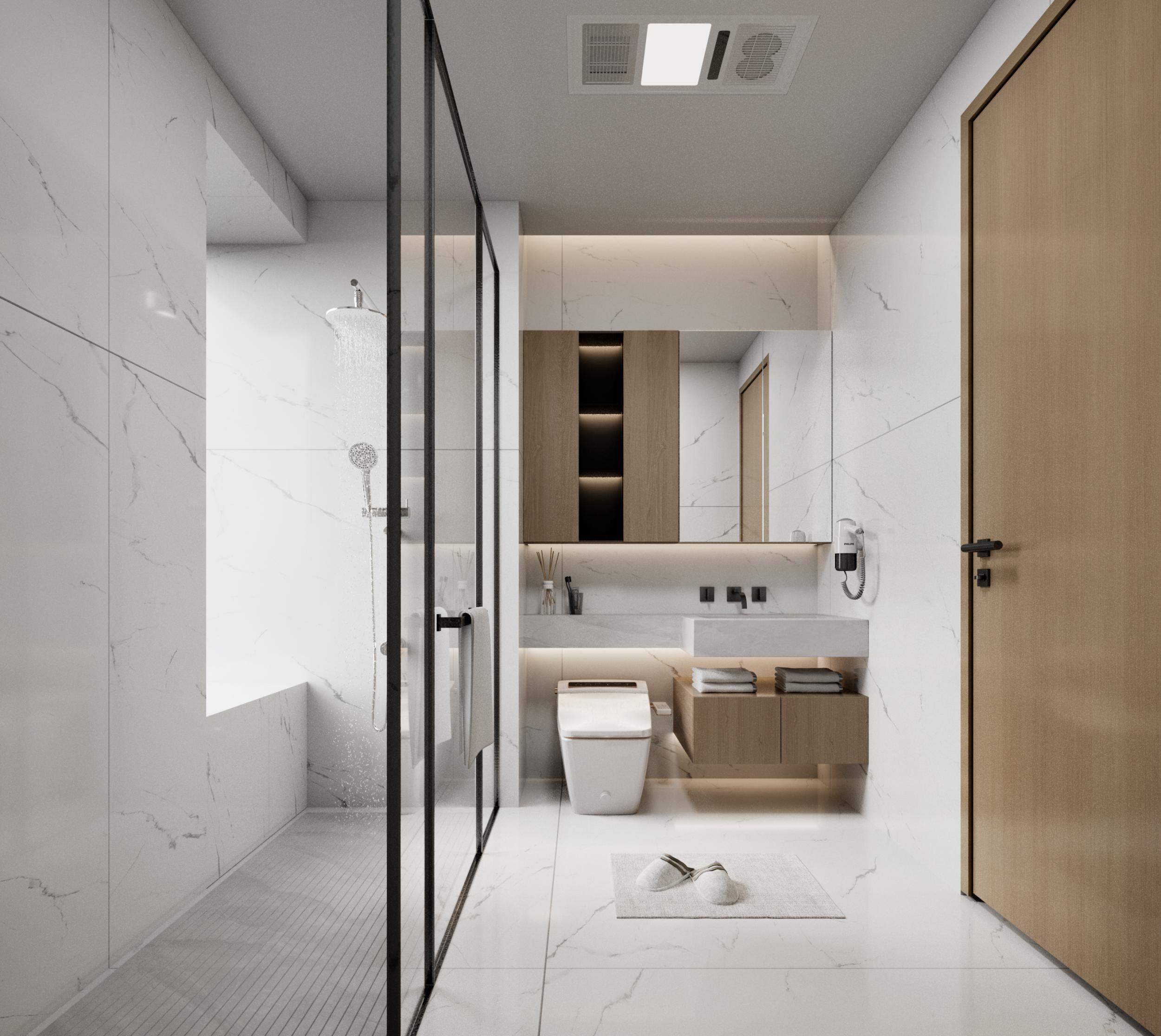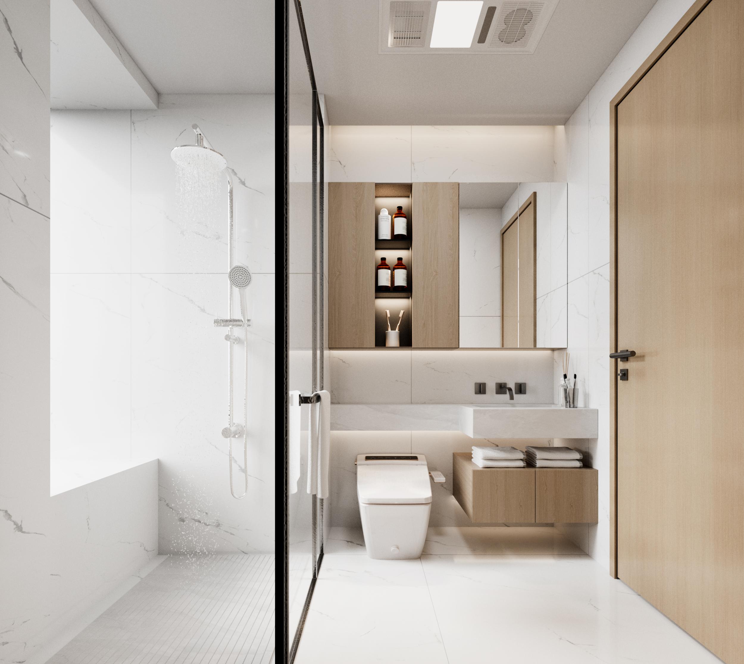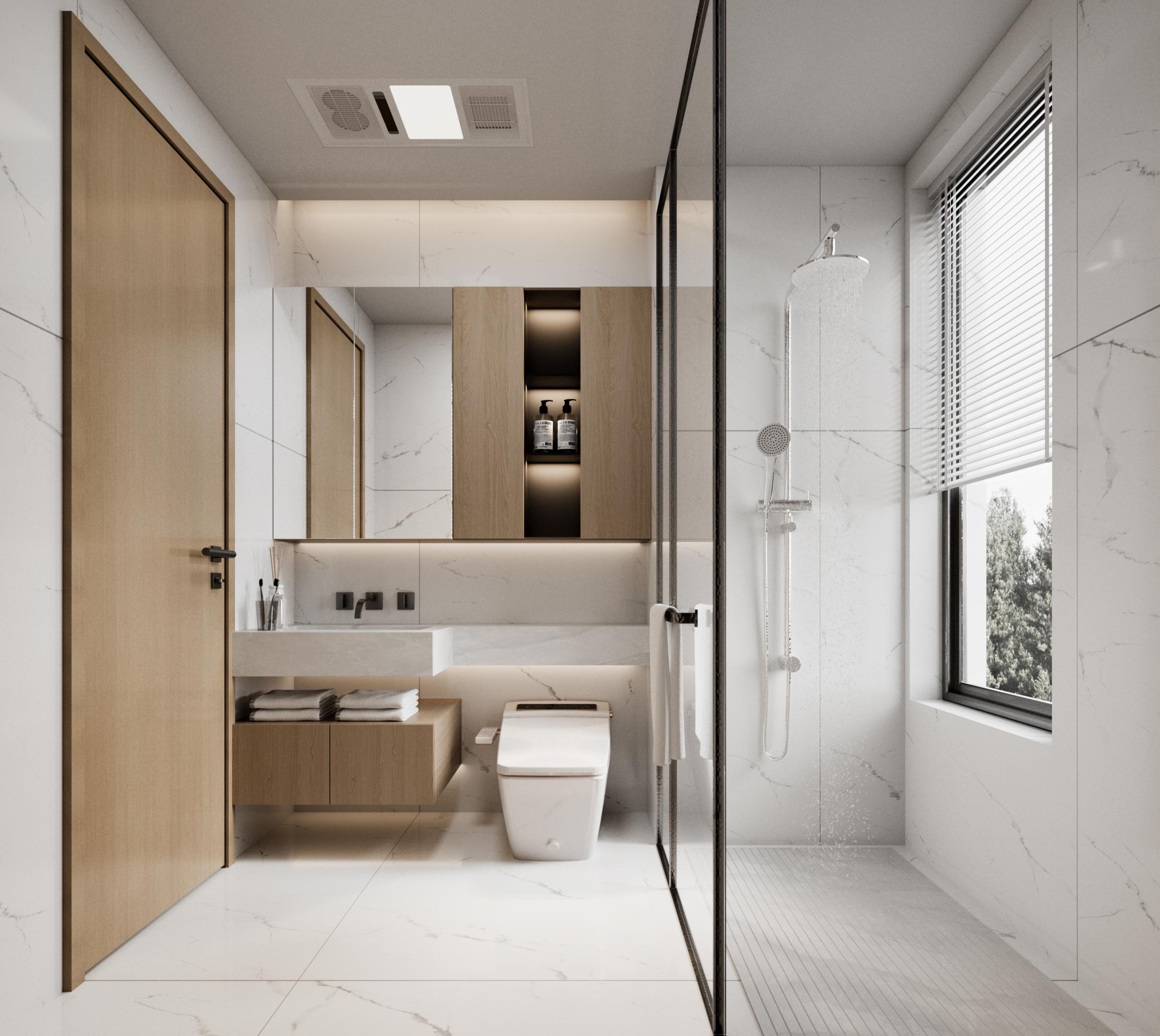 一楼卫生间以白色大理石瓷砖为主,搭配浅木色柜体,强化自然质感。干湿分离的玻璃隔断提升实用性,镜柜 + 开放格收纳兼顾整洁与便捷,暗藏灯带营造温馨氛围,在洗漱场景展现日式风格细节精致度,实现功能与美学平衡。