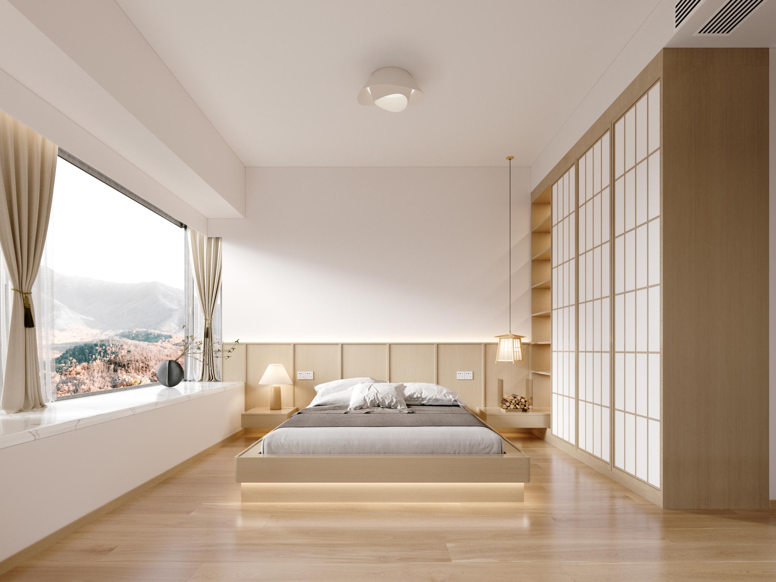 一楼卧室延续日式简约基调,浅木色地板、白色墙面搭配原木家具,构建温馨自然氛围。悬浮床设计搭配线性灯带,增添简洁感;日式推拉门衣柜兼具收纳与风格展示,大面积飘窗引入山景,使睡眠空间成为自然观景台,传递舒适与禅意。