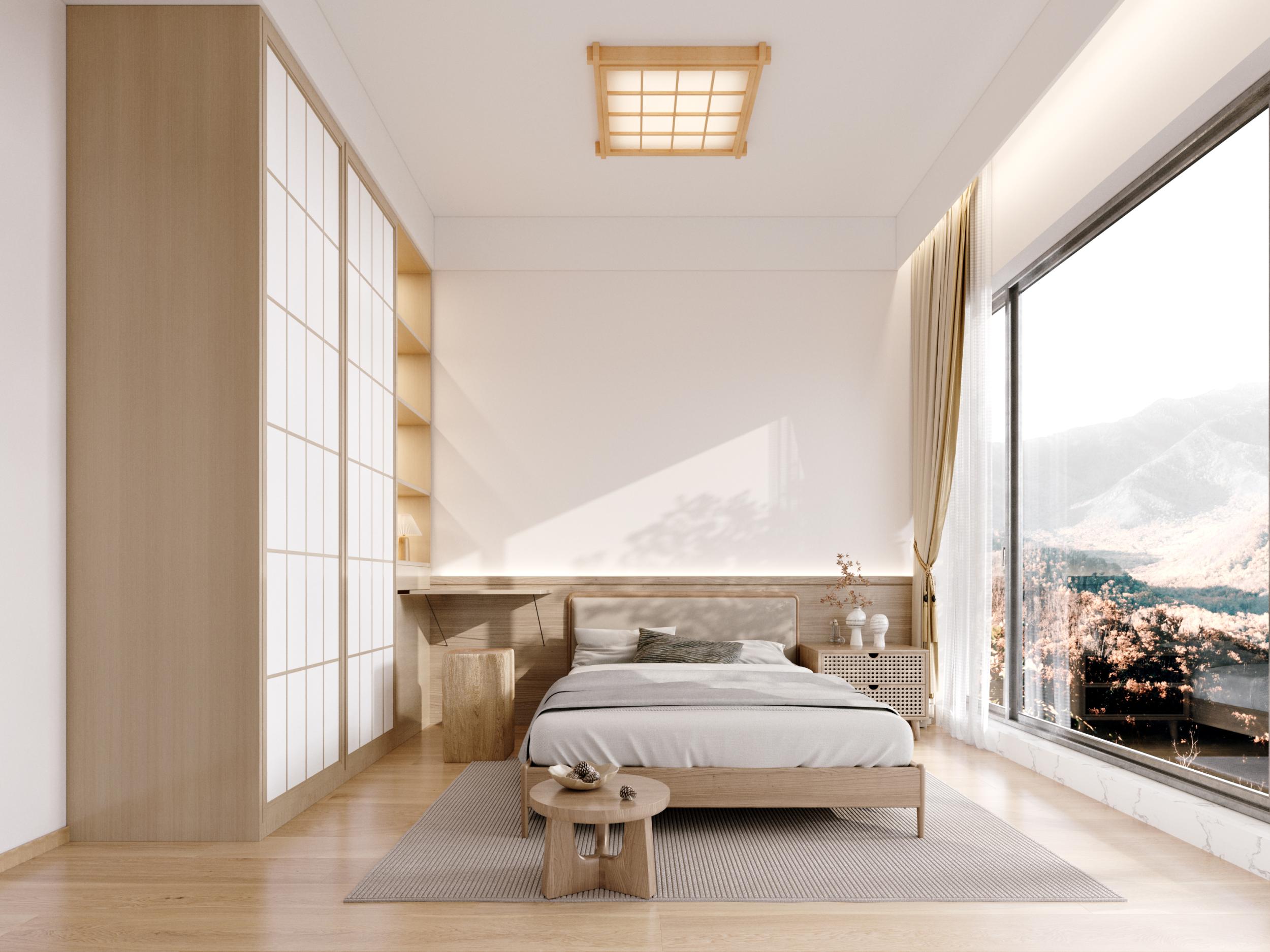 二楼主卧聚焦静谧休憩,浅木色地板、白色墙面搭配原木家具,营造温馨氛围。和室灯、矮脚家具演绎传统日式元素,浅棕背景墙与藤编家具拓展风格层次,大面积开窗引入山景,使睡眠空间与自然相融,打造专属静谧休憩天地。