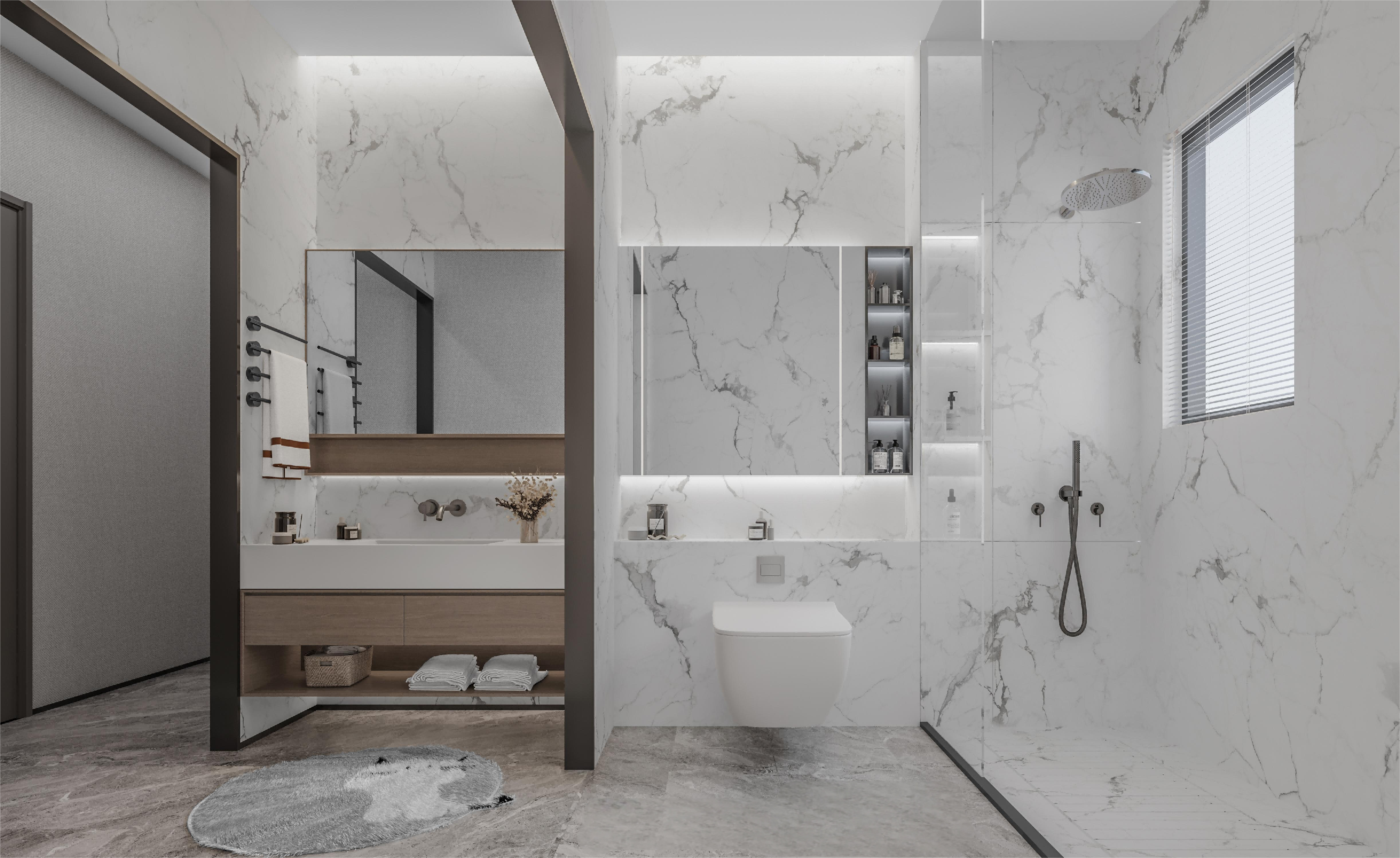 客卫以白色大理石为主,搭配浅木色柜体,镜柜 + 壁龛设计满足收纳需求,暗藏灯带营造温馨氛围,简约布局适配日常使用场景,传递现代简约风格的 “实用与整洁”。