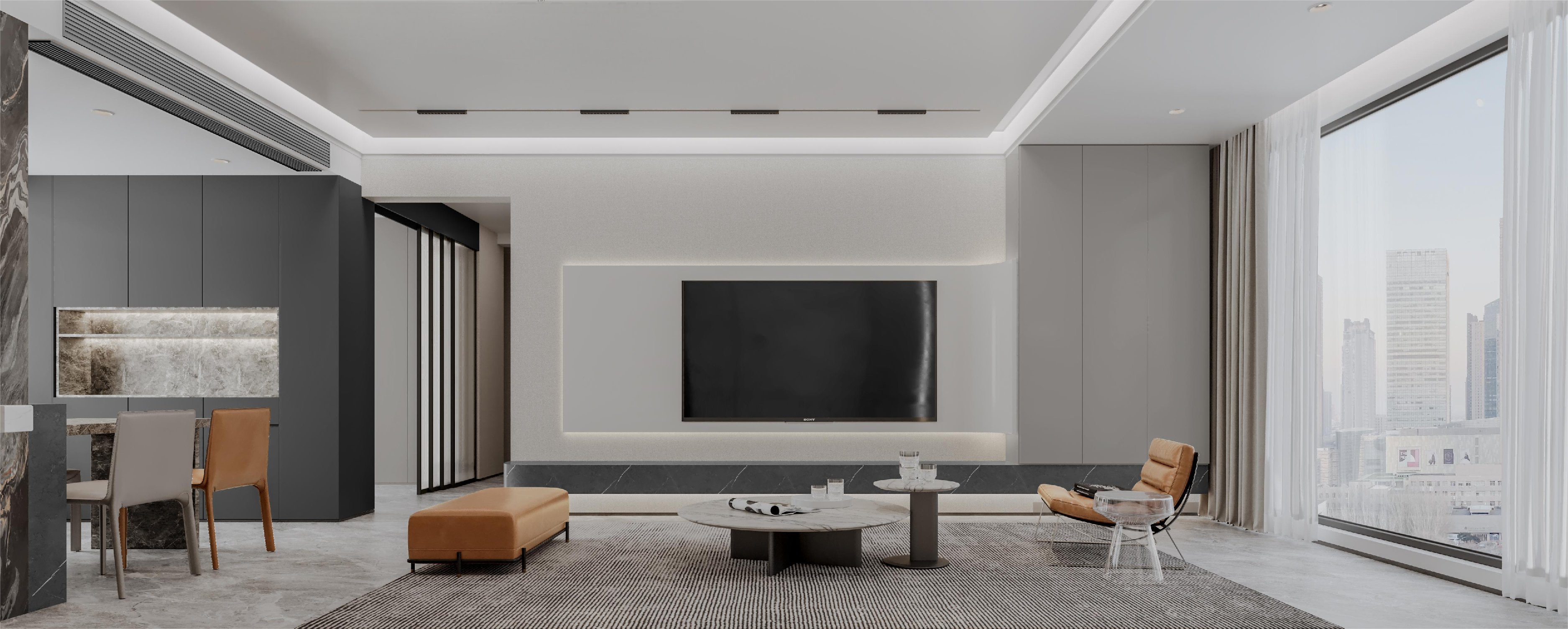客厅以高级灰为主色调,搭配浅灰色大理石地面,营造简洁大气氛围。无主灯设计 + 线性灯带,强化空间现代感;浅米色沙发、橙色单人椅与小皮墩,平衡色调增添活力;开放式布局串联客厅与餐厨区,大面积落地窗引入城市景观,让休闲场景与都市视野交融,诠释现代简约的 “空间通透感”。