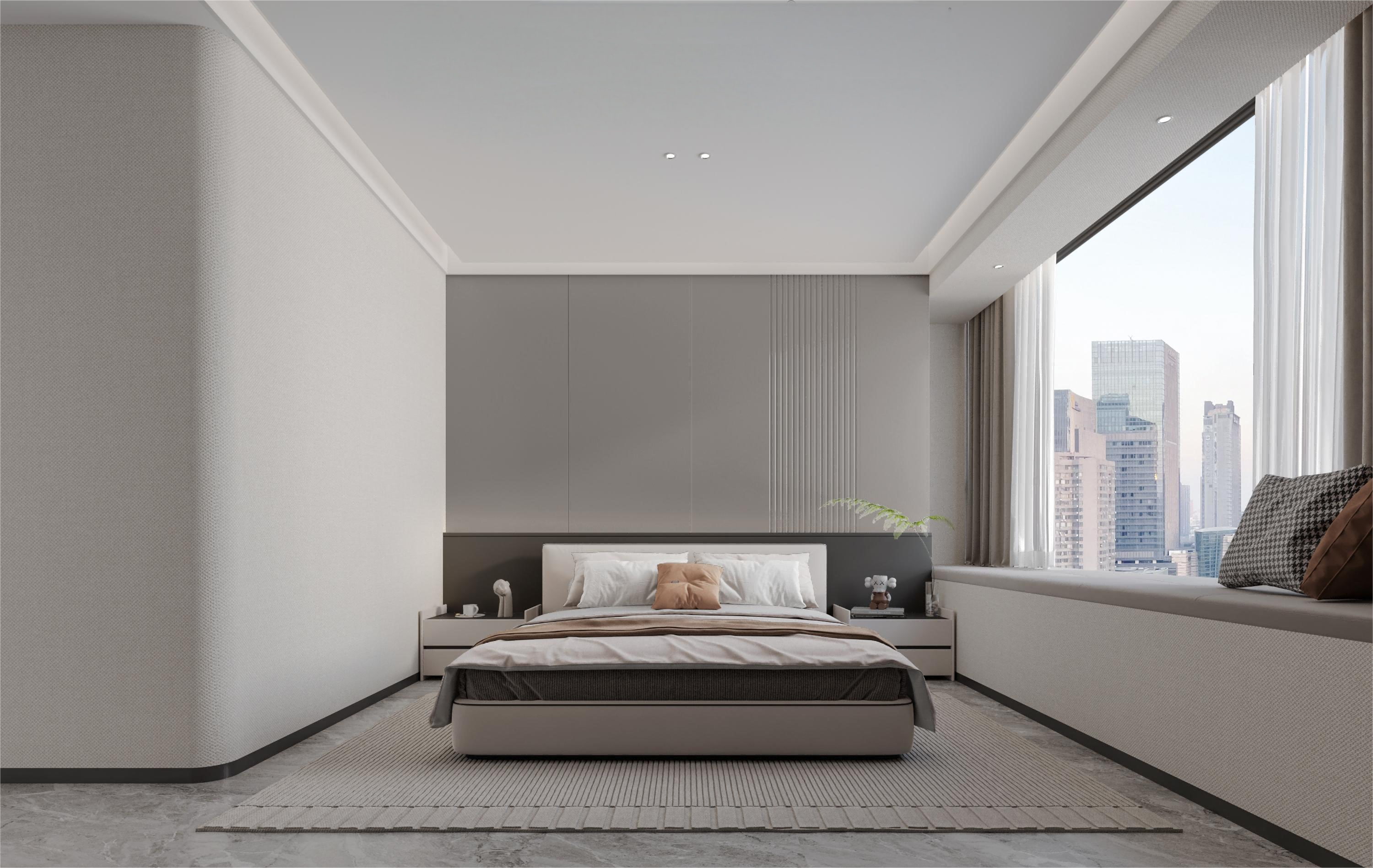 主卧延续现代简约基调,浅灰墙面、灰色地面搭配低饱和床品,构建静谧休憩氛围。悬浮床设计 + 无主灯照明,简化空间视觉;转角飘窗与城市景观相连,打造专属观景角落;一体化衣柜嵌入墙体,保障收纳功能同时,维持空间整洁感,传递现代风格的 “实用美学”。