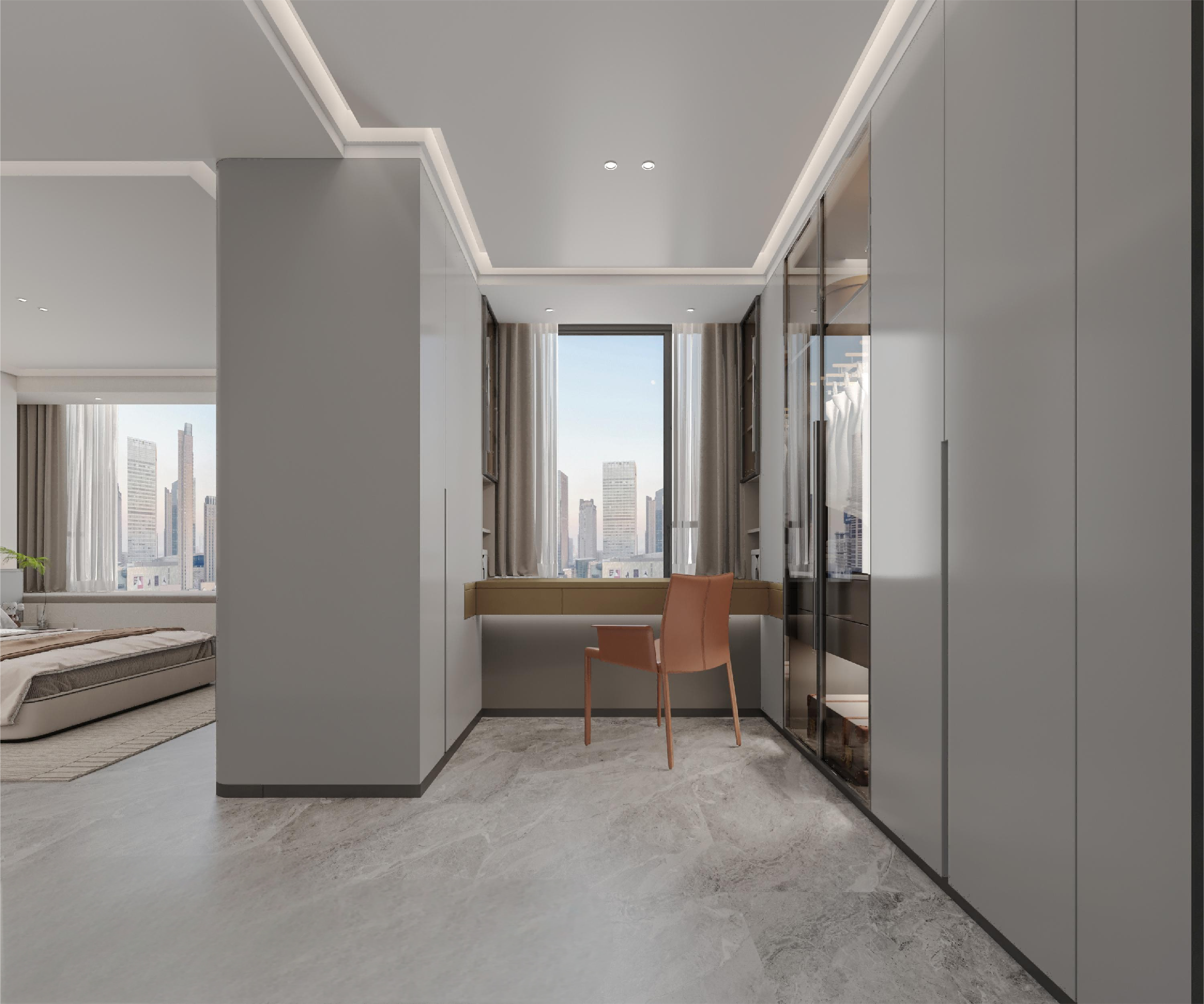 衣帽间延续整体现代简约风格,浅灰色调墙面、地面搭配定制衣柜 + 梳妆台组合,构建一体化收纳梳妆空间。玻璃衣柜门便于衣物拿取展示,橙色座椅呼应客厅活力元素;大窗引入城市光线,让衣物收纳、日常梳妆场景在简约布局中有序开展,适配现代精致居住需求,诠释现代简约风格在功能空间的 “高效与质感”。