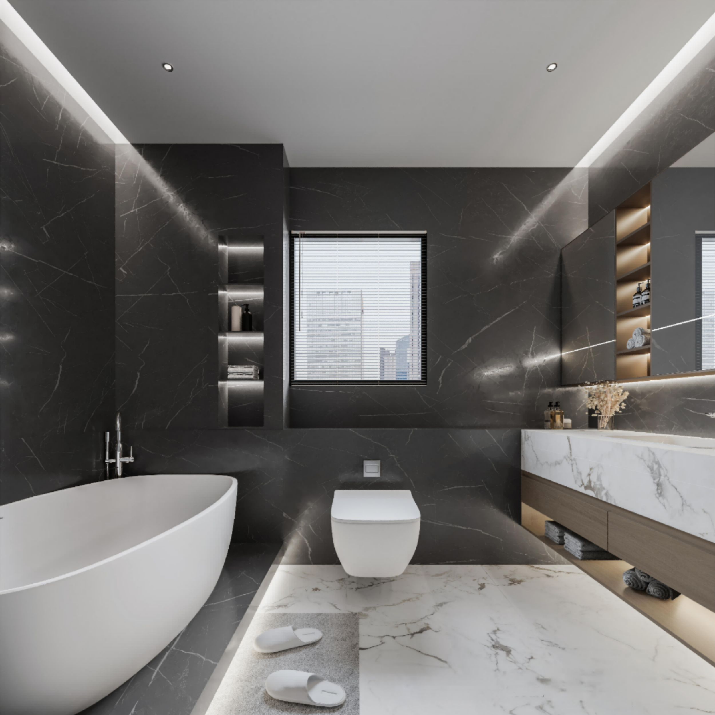 主卫用深灰大理石打造 “高级暗调” 空间,悬浮马桶、独立浴缸布局,壁龛 + 镜柜满足收纳,黑白配色强化现代质感,营造专属私密的高端洗漱氛围,诠释现代简约在主卧配套空间的 “精致与格调”。