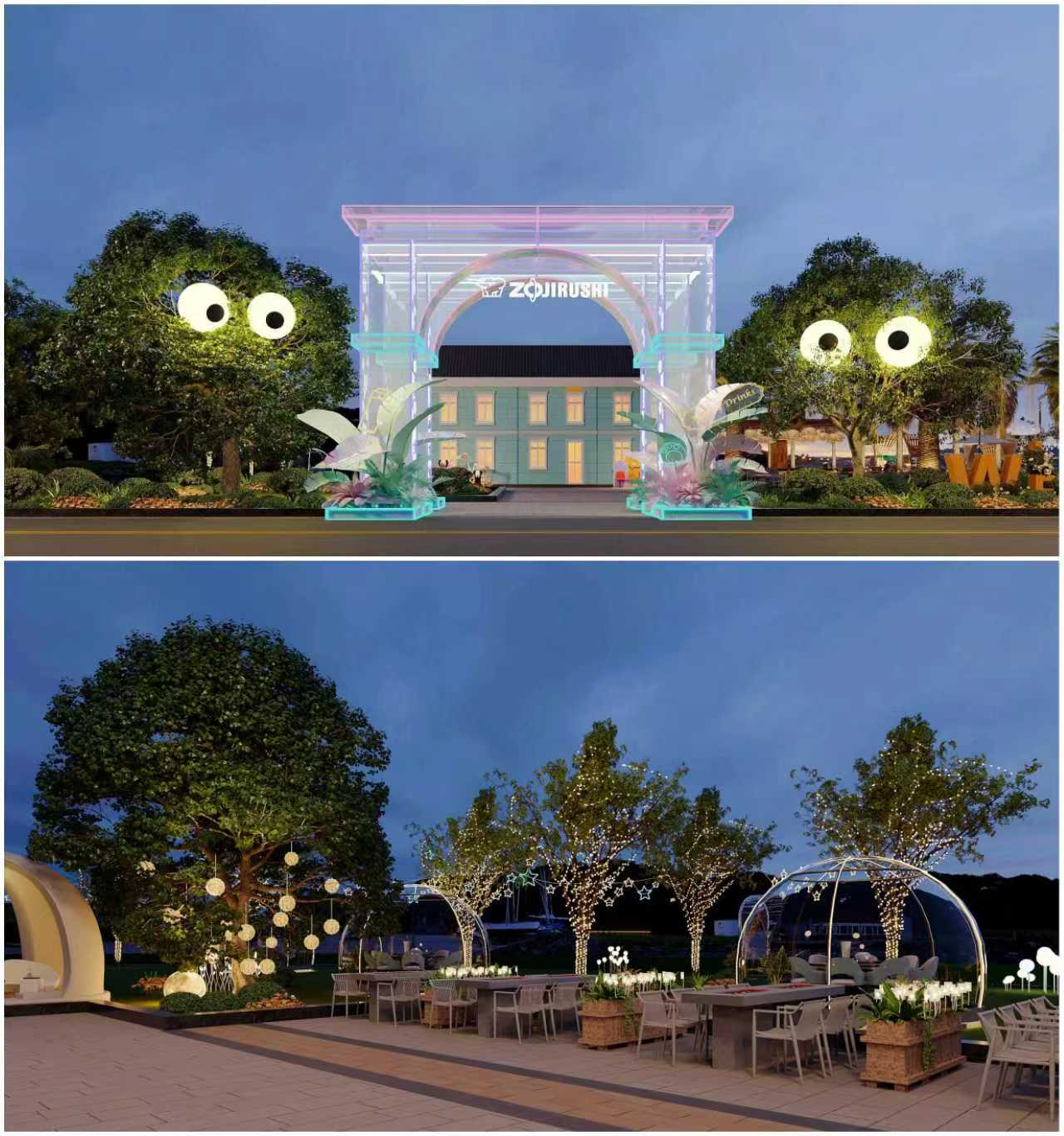 入口门户区:透明霓虹拱门搭配 “大眼睛” 树饰,形成视觉冲击,成为网红打卡第一站。