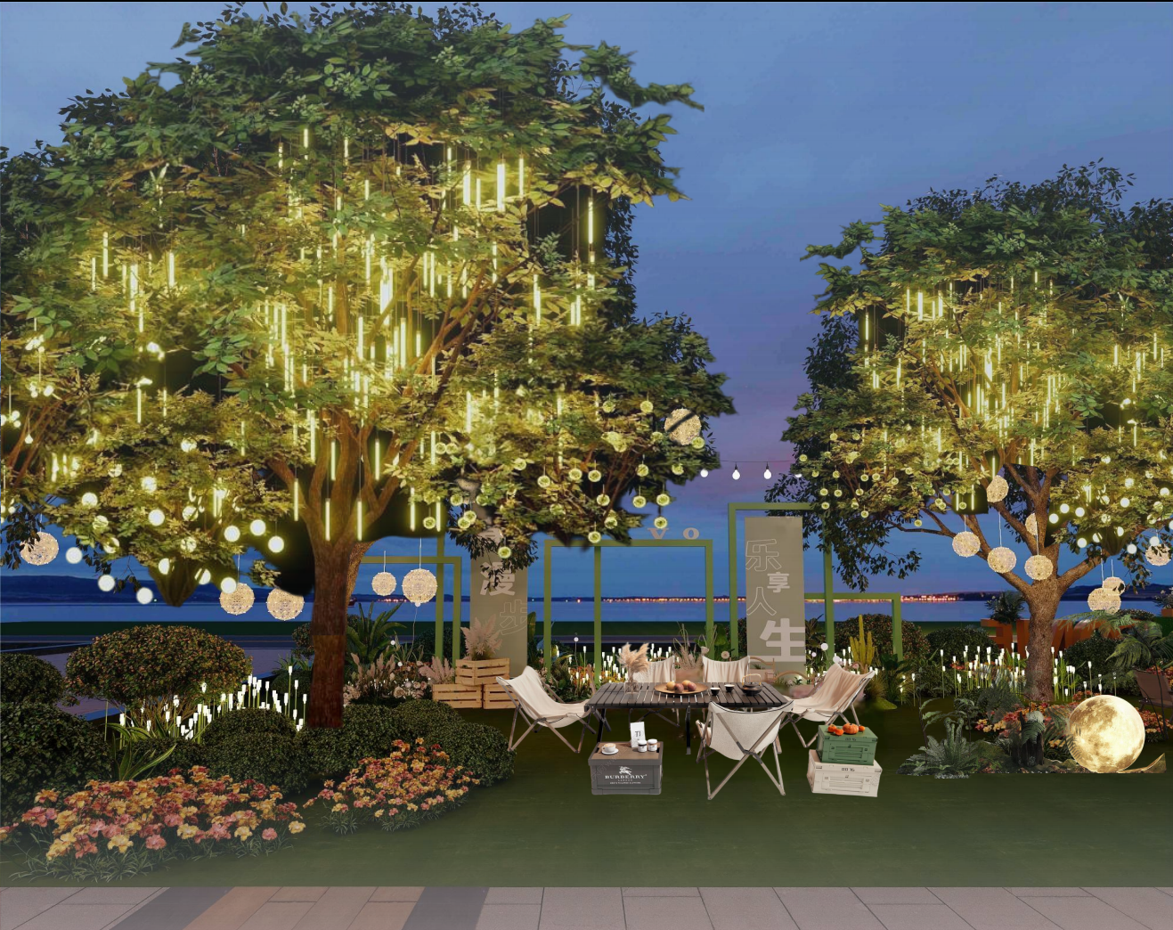 树景灯光区:大树缠绕冰柱灯、球形灯,地面花艺点缀,营造 “仲夏夜之梦” 氛围;