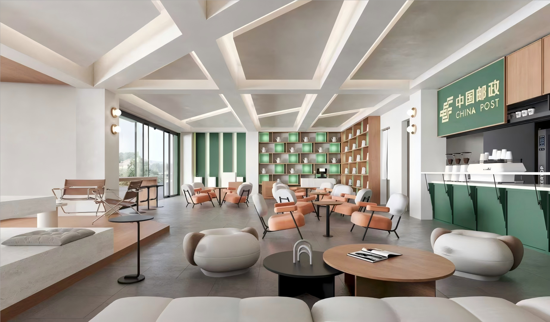 功能叠加:整合 邮政文创展示、咖啡茶饮服务、社交休憩 功能,让空间成为 “文化 + 消费” 的链接点。
