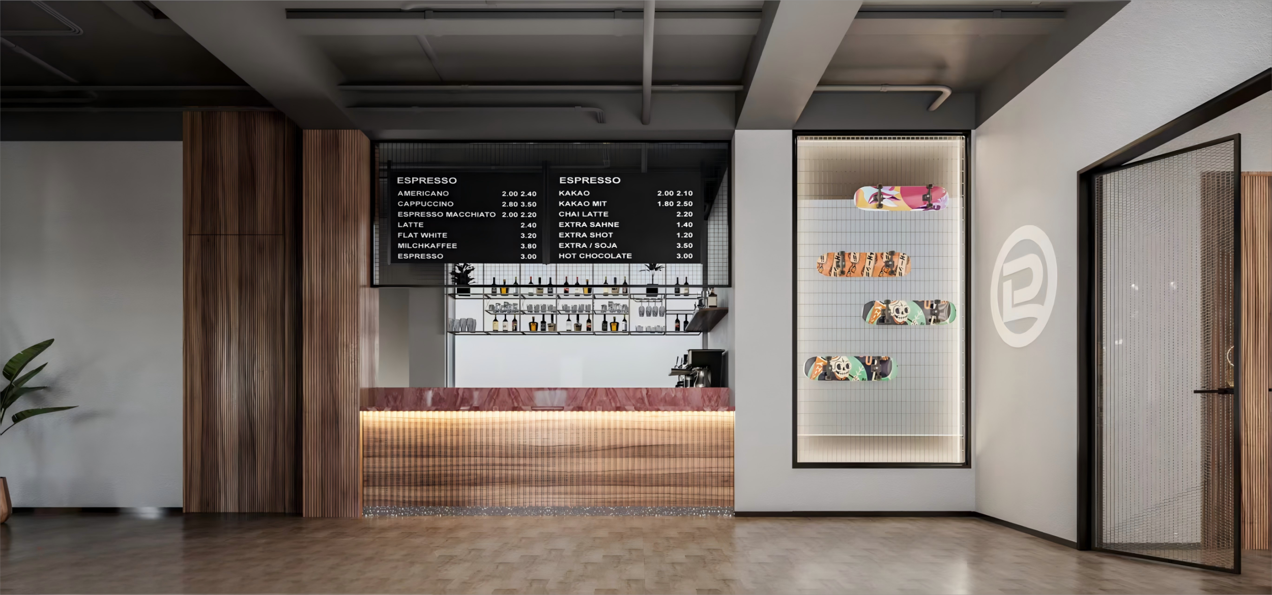 吧台体验区:黑板菜单墙、木质吧台搭配复古酒瓶陈列,凸显社交属性。侧墙滑板陈列区以灯光烘托,成为年轻客群打卡点,传递集团活力文化。