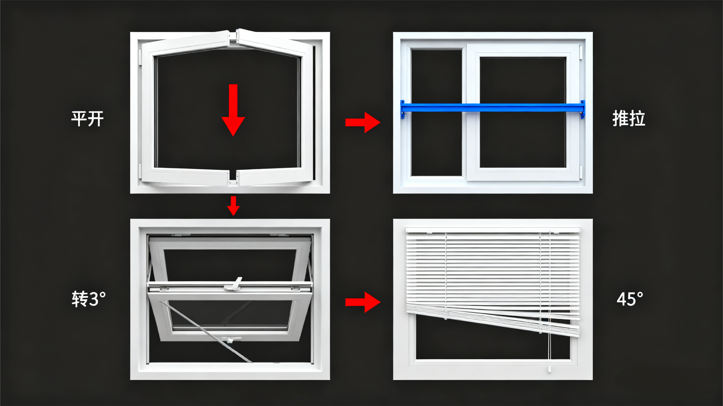 平开窗:窗扇向内或向外推开,密封性好,适合卧室、书房(需隔音),但要预留开启空间;