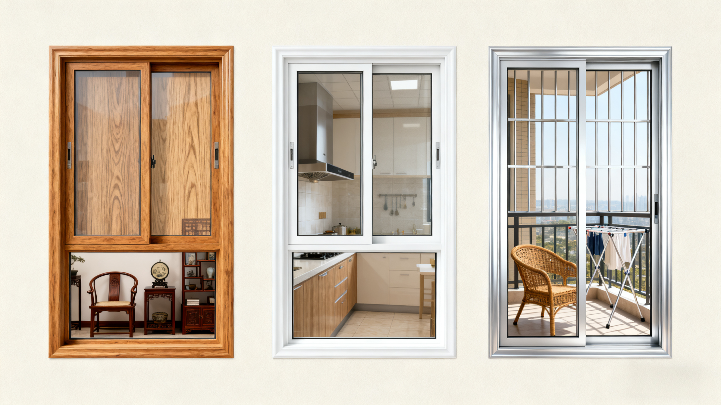 塑料窗(塑钢窗):隔热、防水性好,价格适中,适合阳台、厨房等潮湿区域,性价比高;
