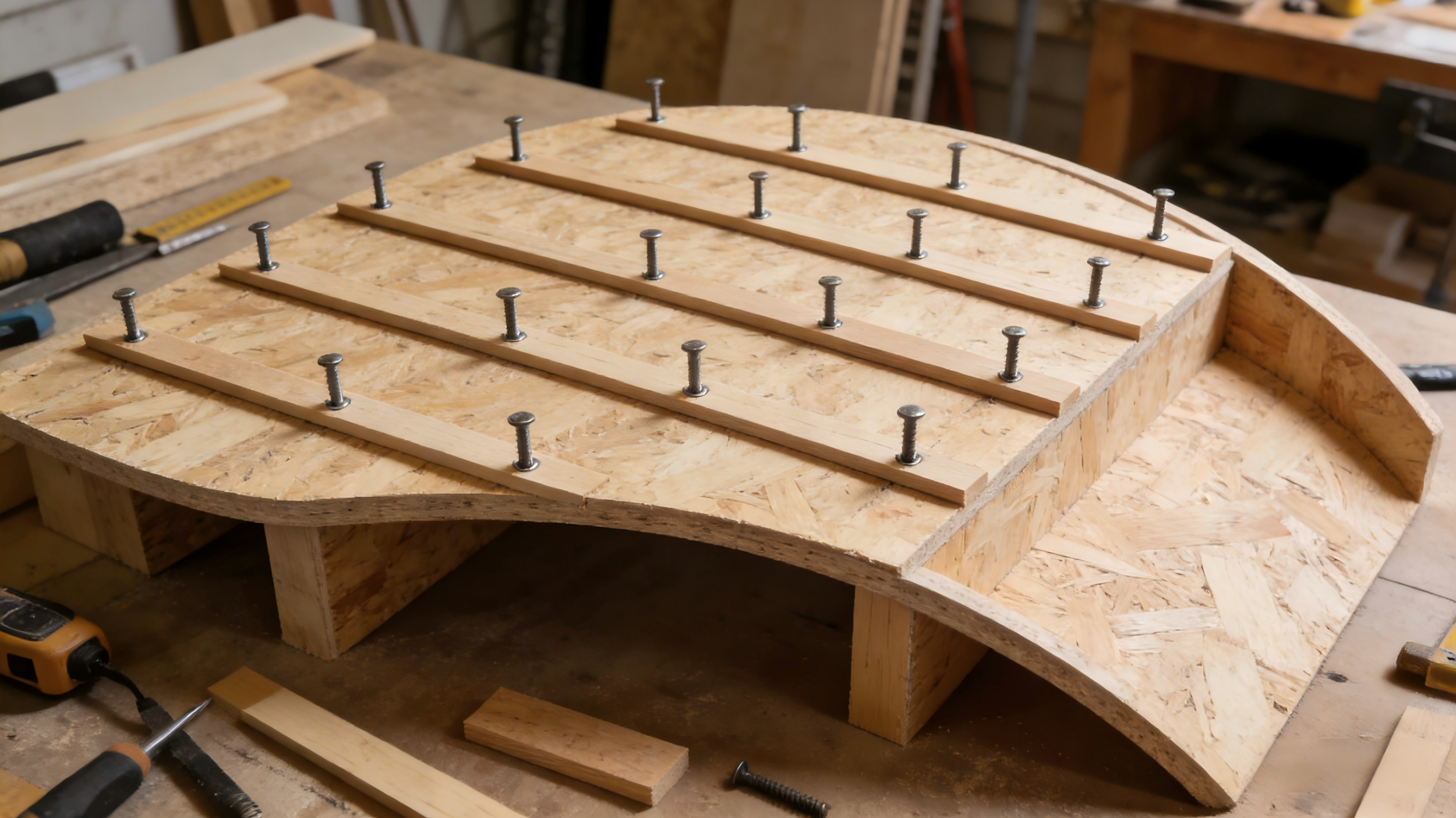 先以大芯板为原料,依照设计弧度制作精准的弧形模型,作为后续固定的基准。将十二夹板锯成20mm宽的条状,按30mm的均匀间距,逐一钉在已完成初步黏结的三夹板表面,钉合时力度适中,避免板材开裂。随后将组装好的结构固定在弧形模型上,调整位置确保弧度一致,最后在外侧再贴合一层三夹板并钉牢,进一步强化结构稳定性与弧度完整性。