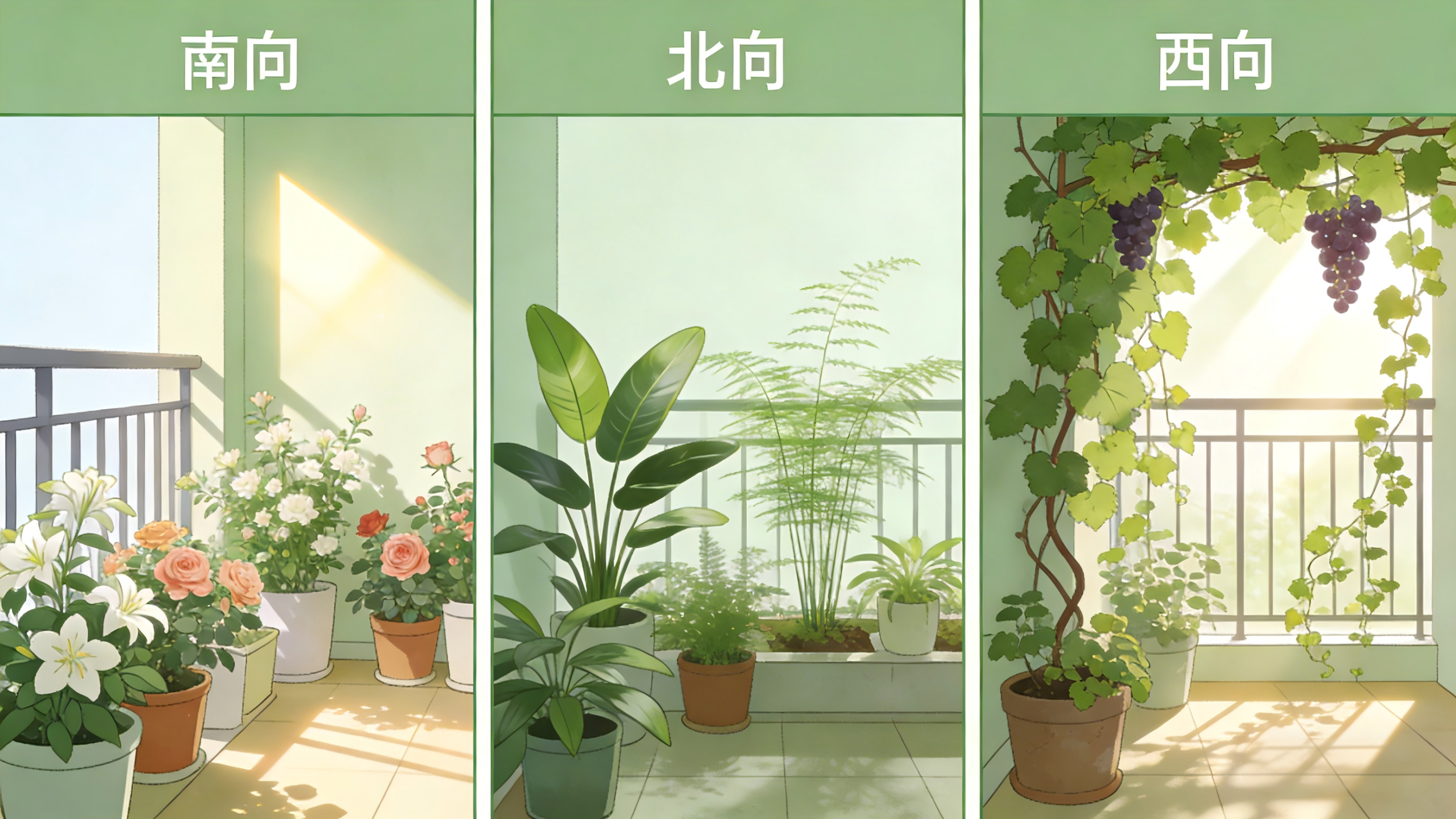 阳台绿植则要根据朝向选择:南向阳台光照充足,适合白兰、茉莉、月季、石榴等喜光花卉;北向阳台偏阴,可选万年青、文竹、天门冬、玉簪等耐阴植物;西向阳台适合牵牛花、常春藤、葡萄等攀援花卉,遮阳降温;东向阳台可摆放竹类、山茶、杜鹃,适配半日光照。