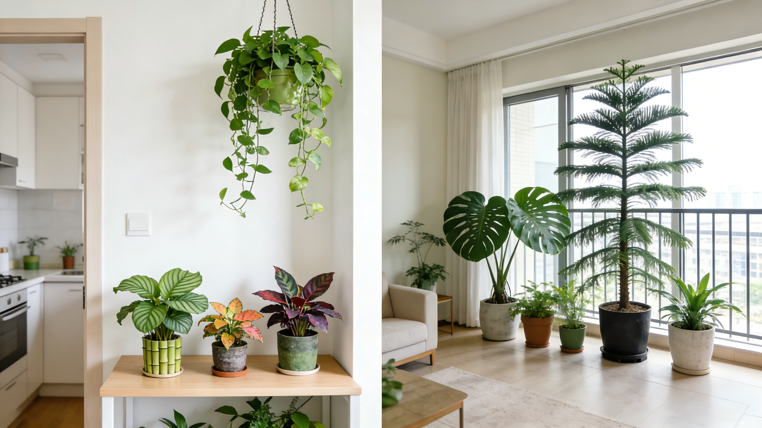 一室一厅房型面积较小、功能集中,绿饰以小巧省空间为核心。可选用竹芋、波士顿蕨、紫叶鸭拓草、彩叶草等小型盆栽作为桌饰,不占用过多空间又能增添绿意。同时充分利用垂直空间,在厨顶、柜边悬挂豆瓣绿、吊金钱、吊兰、花叶绿萝等耐阴垂吊植物,再点缀几盆色彩鲜艳的盆插或瓶花,让小空间更显温馨灵动。