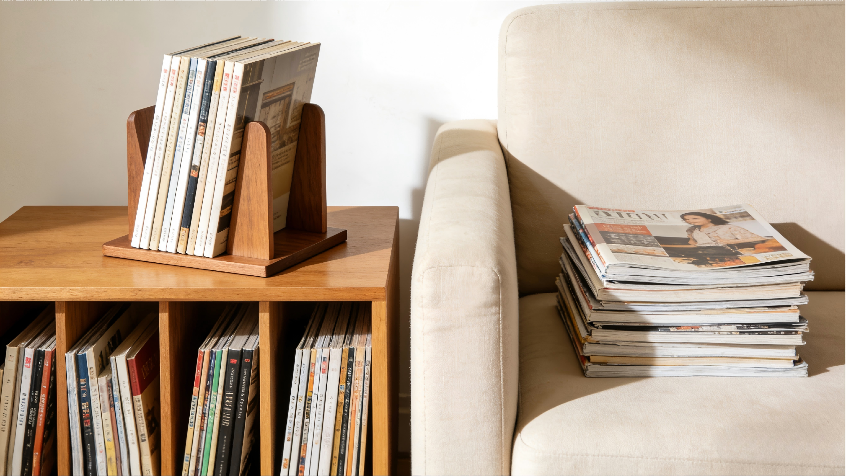 其次要按内容分类摆放,同一类别书籍集中陈列,横竖搭配、高低有序,书脊前沿对齐,避免杂乱无章。书桌可用书档收纳,既整齐又添书香氛围;茶几、沙发旁可摆放画报杂志,打造轻松的休闲阅读角,适配现代家居生活。