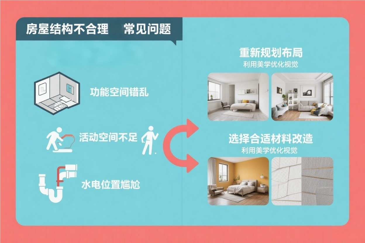 在购房与家装过程中,不少人会遭遇房屋结构不合理的难题。无论是功能布局错乱,还是空间尺度尴尬,又或是水电基础设置不佳,都犹如阻碍家居品质提升的 “绊脚石”。不过别担心,通过合理规划与巧妙设计,这些问题都能迎刃而解。