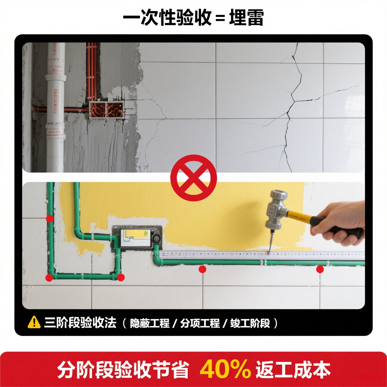 某工地因未做防水验收就铺贴瓷砖,完工后楼下渗水,返工损失达 3.8 万元,印证了 "隐蔽工程不验收,后患无穷" 的道理。
