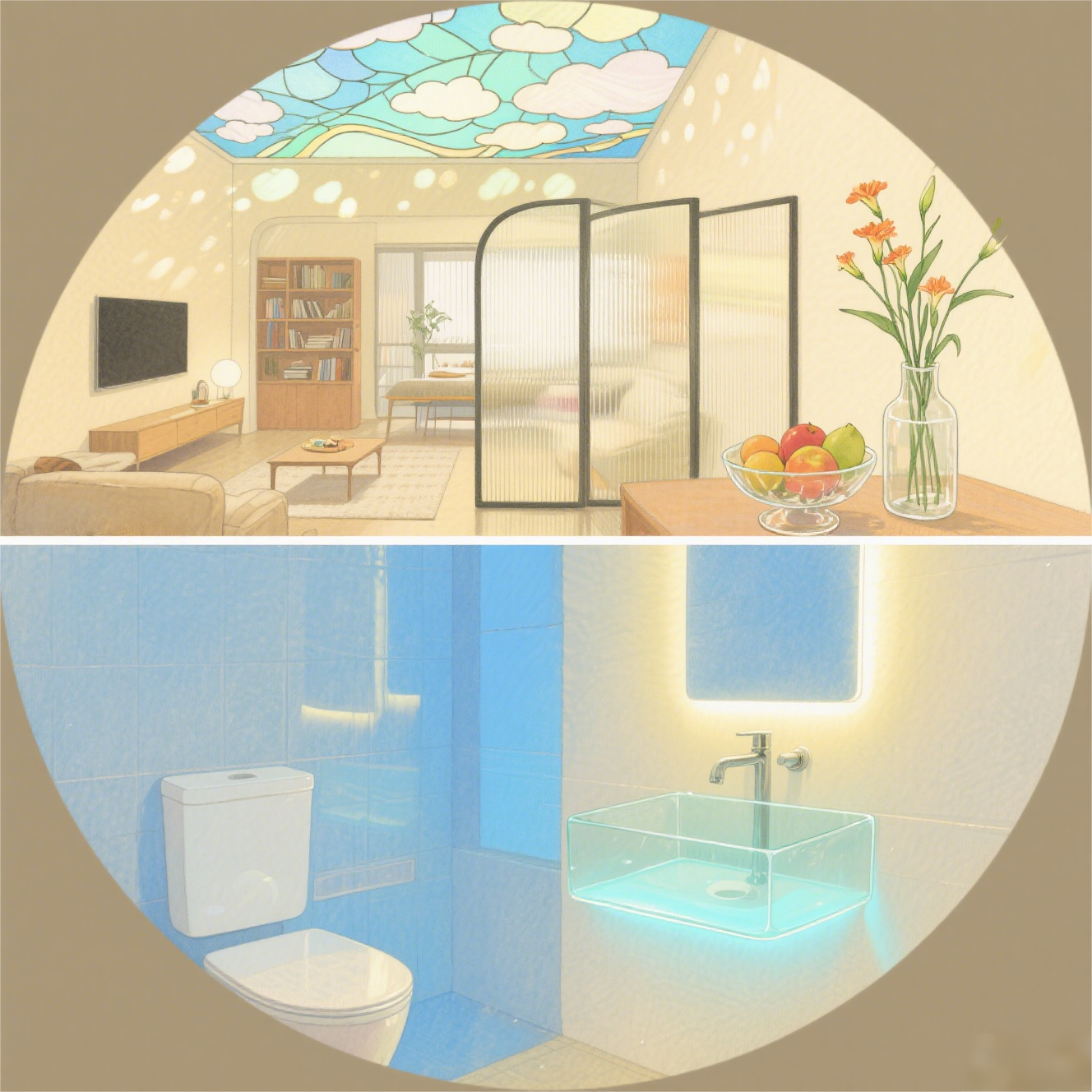 更妙的是 “光影联动”:卫生间的墙面贴蓝色瓷砖,搭配玻璃台面的洗手池(台下装一盏冷光灯),灯光透过玻璃,把墙面映成一片浅蓝,像置身海边;客厅的天花板装一块彩绘玻璃(图案选抽象的云朵),顶灯的光线透过玻璃,地面便有了流动的光斑,晚上关灯后,玻璃在月光下又像一块温润的玉。